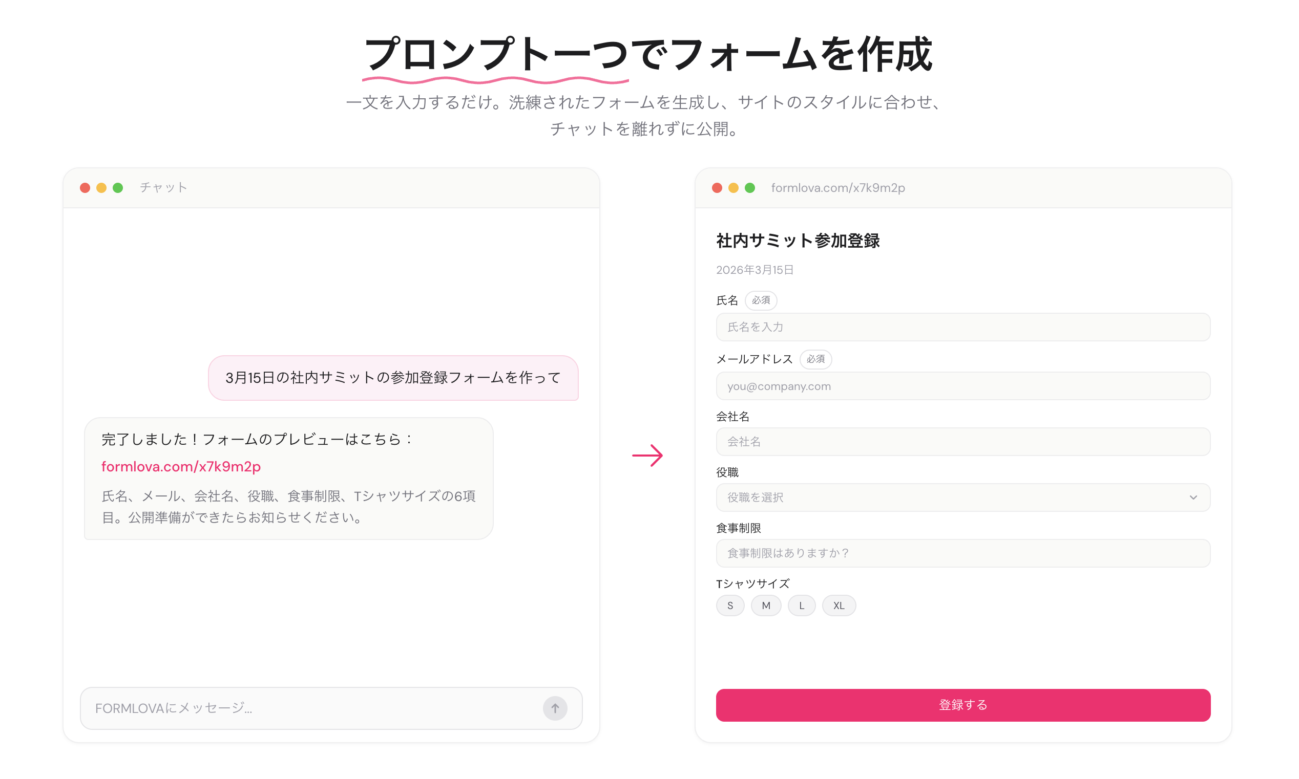 フォームの作成から運用・分析・メールまで、AIチャットで完結。MCP対応127ツール