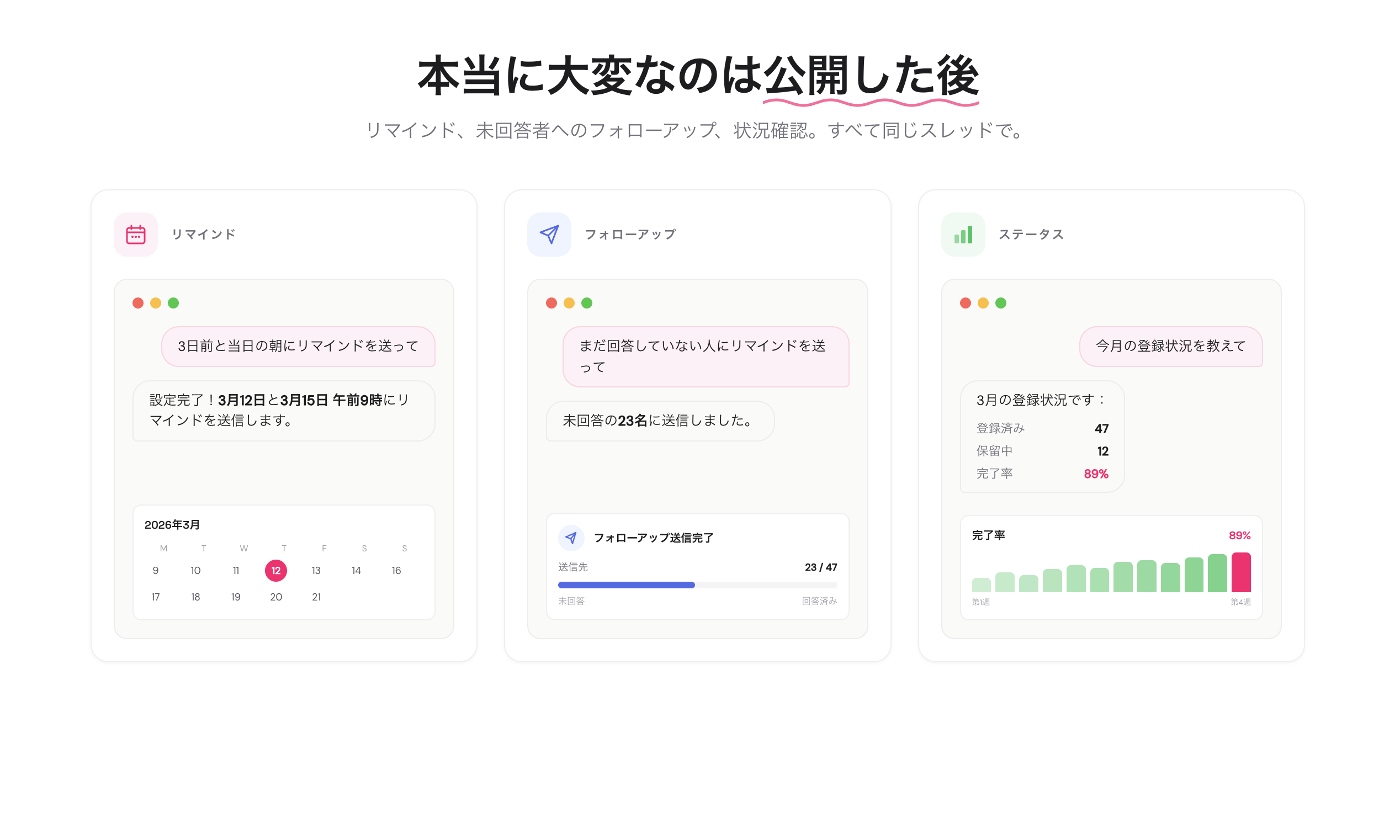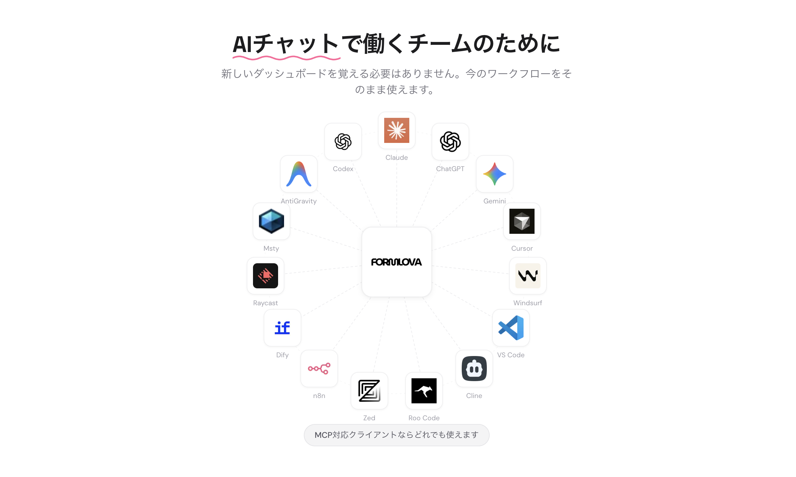 Claude・ChatGPTなど普段のAIから、フォーム運用をまるごと操作。リマインド、フォローアップ、条件付きメール、分析レポートまで会話で完結。MCP対応127ツール。