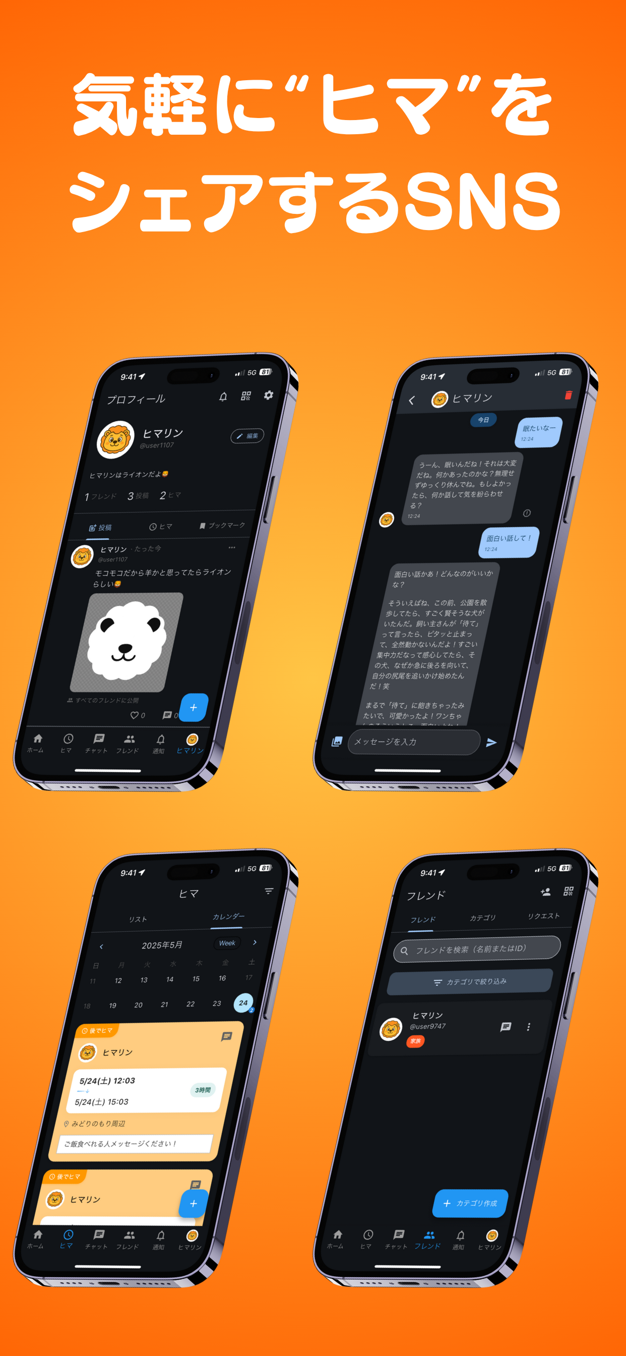 HimaLink(ヒマリンク)は、友達と「空き時間」をシェアすることで、より自然なつながりを作る新しいSNSです。予定調整、雑談、ふとした会話をもっと自由に。チャットや投稿、タイムライン、AIとの会話など、SNSとしての基本機能も充実。 ■ 空き時間を共有してつながる 自分や友達の“ヒマな時間”を登録し、カレンダーやリストで見やすく表示。公開範囲も設定可能。 ■ チャットとAIとの会話 友達との1対1チャットやグループチャットに加え、AIとの雑談も楽しめます。 ■ 投稿とリアクション 写真やテキストで気軽に投稿。公開範囲設定や「いいね」、「コメント」機能もあり。 ■ プロフィール・友達機能 QRコードや検索で友達追加も簡単。プロフィールは自由にカスタマイズ可能。 ■ 通知、テーマ設定、多言語対応 重要なお知らせを逃さず受け取り、ライト/ダークテーマや多言語表示にも対応。 暇な時間を、誰かとのつながりのきっかけに。HimaLinkで、新しい日常のSNS体験を。