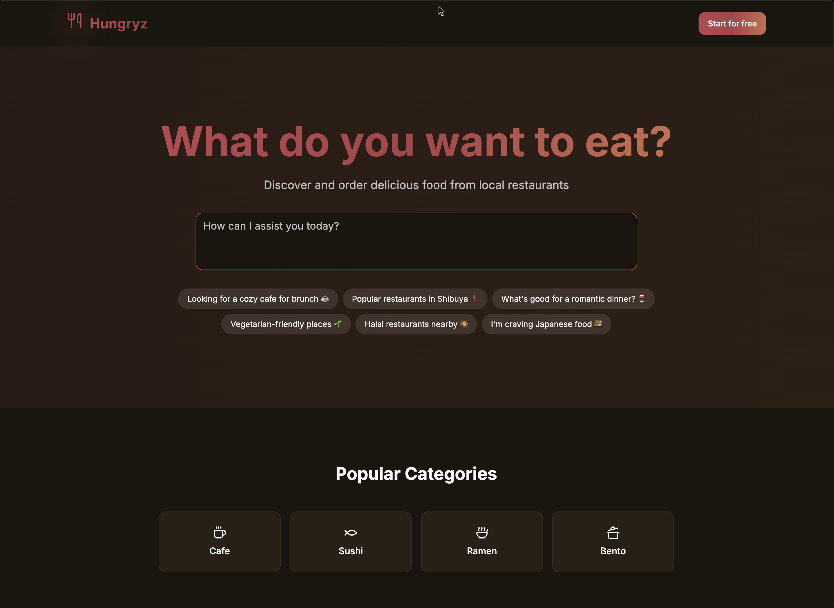 「Hungryz」 は、AIと会話しながらレストランを検索できるアプリです。 食の好み、アレルギー、食事制限などを考慮するよう、パーソナライズ機能であなたにぴったりのレストランを提案します。 将来的には、多言語対応、自動予約や会話からのレストラン提案など、さらに便利な機能を追加予定! まずはインバウンド向けとして英語版をリリースしました。 僕は昔、カナダに行った時に英語が全く話せず、ご飯買うのも苦労して泣いた日々があったのでAIが「今日、何食べる?」と聞いてくれると嬉しいなと思い、開発しました。 訪日外国人旅行者数が過去最高となる中、何か日本のおもてなしをできないかと思っています! ぜひ、応援よろしくお願いします!