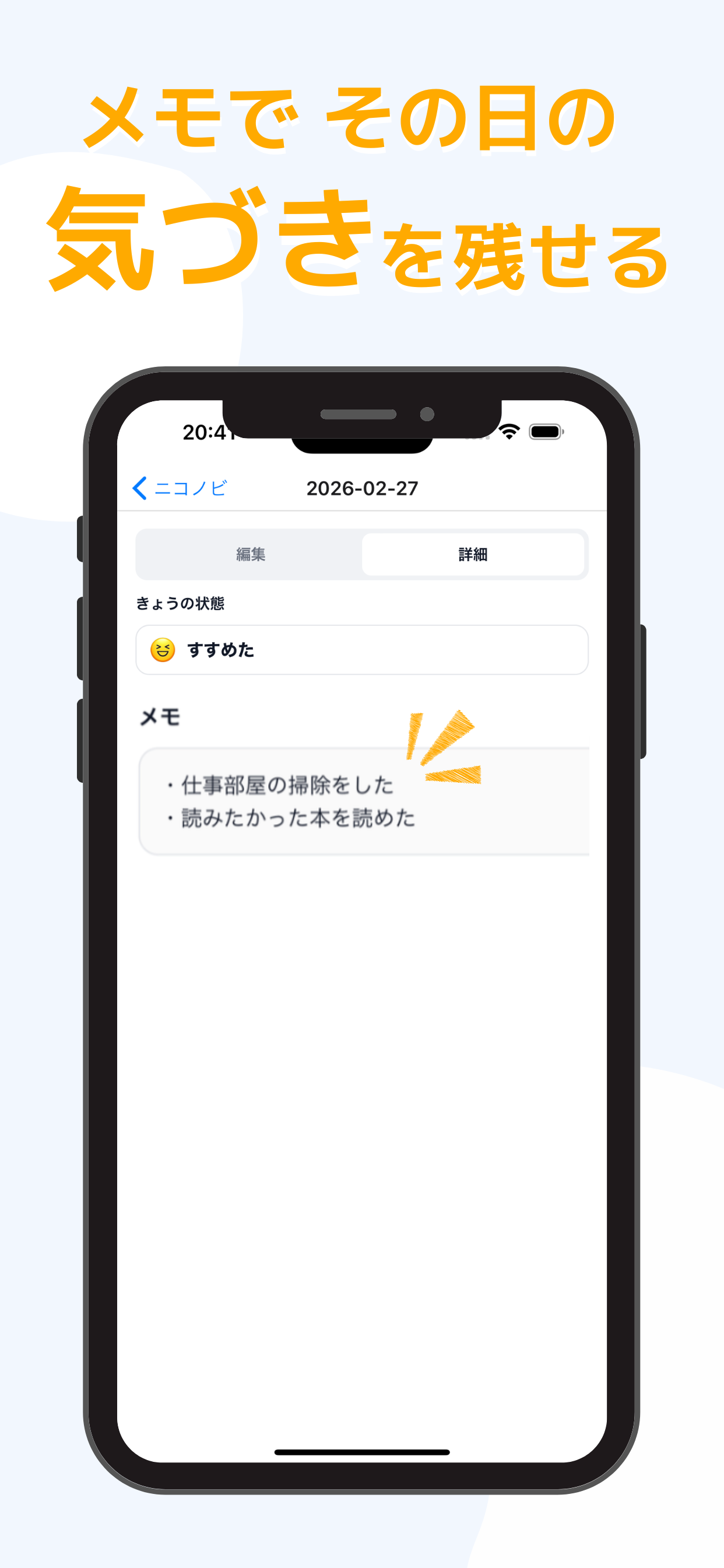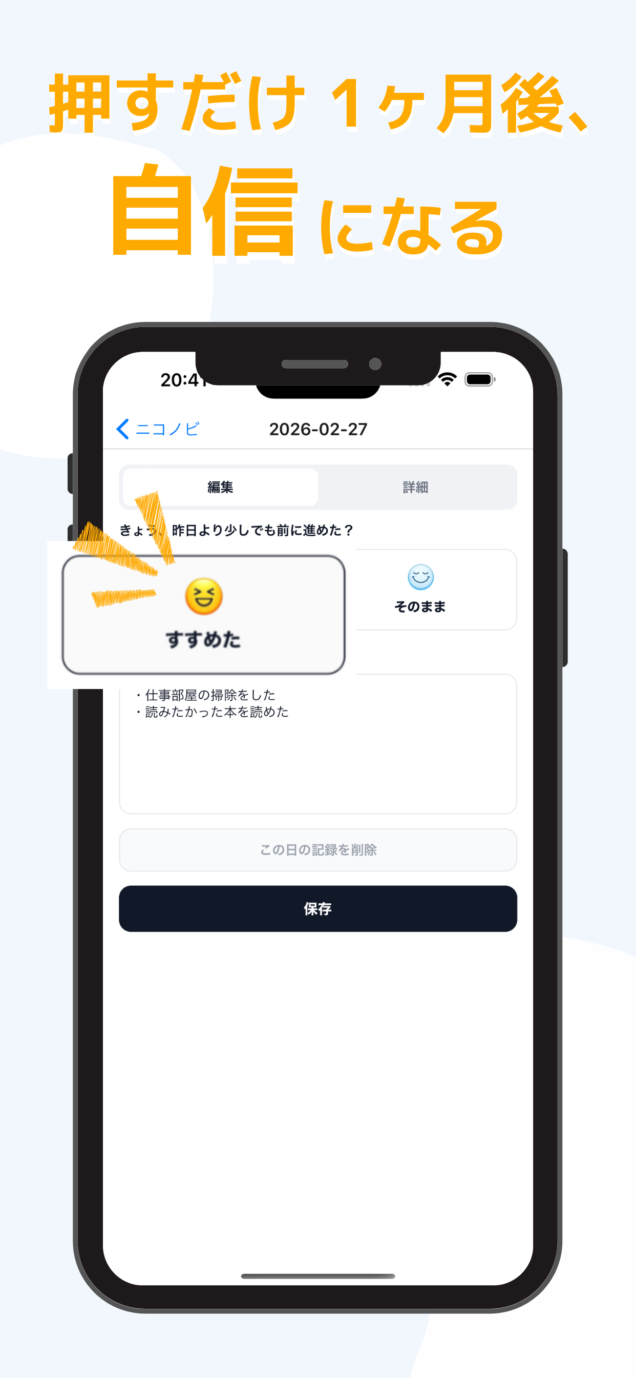 ■ ニコノビってどんなアプリ? 「きょう、昨日より少しでも前に進めた?」 この1問に、「すすめた」か「そのまま」で答えるだけ。たった2択だから、毎日続けられます。 ■ こんな方におすすめ ・習慣をつけたいけど、続かない ・日記を書きたいけど、何を書けばいいかわからない ・毎日の小さな進歩を残したい ・シンプルな記録アプリを探している ■ 主な機能 ・1日1タップで記録 「すすめた」「そのまま」の2択だけ。迷わず、すぐ記録できます。 ・カレンダーでひと目で確認 月ごとに記録を振り返れます。続けている実感が、やる気につながります。 ・メモで気づきを残せる(任意) その日の出来事や気づきを、自由にメモできます。後から読み返すと、自分の変化がわかります。 ・励ましメッセージ 記録に応じて、ちょっとした励ましの言葉が表示されます。 ■ 続く理由 ・操作がシンプル 複雑な設定は不要。開いて、タップするだけです。 ・負担が少ない 長文を書く必要はありません。2択で答えるだけなので、忙しい日も続けられます。 ・見た目がすっきり 余計な機能がなく、記録に集中できます。 ■ 使い方 1. カレンダーから日付をタップ 2. 「すすめた」か「そのまま」を選ぶ 3. 必要ならメモを追加 4. 保存 これだけです。 ■ 無料でご利用いただけます ニコノビは無料でお使いいただけます。広告表示により運営しています。 毎日の一歩を記録して、続く習慣をはじめませんか?