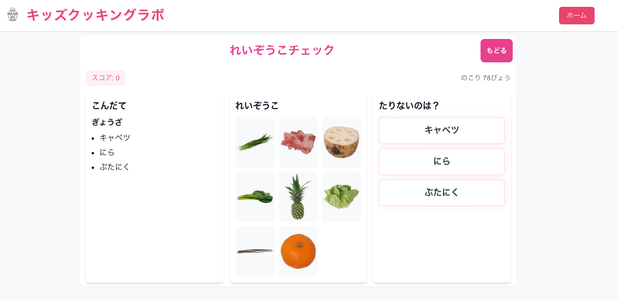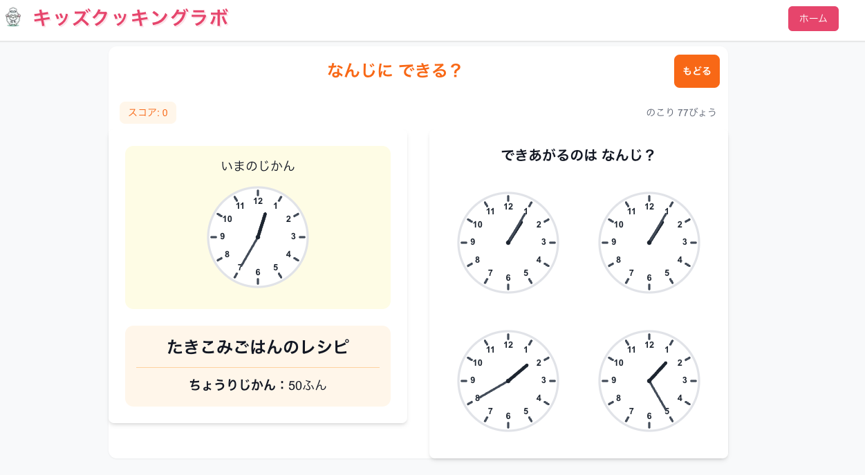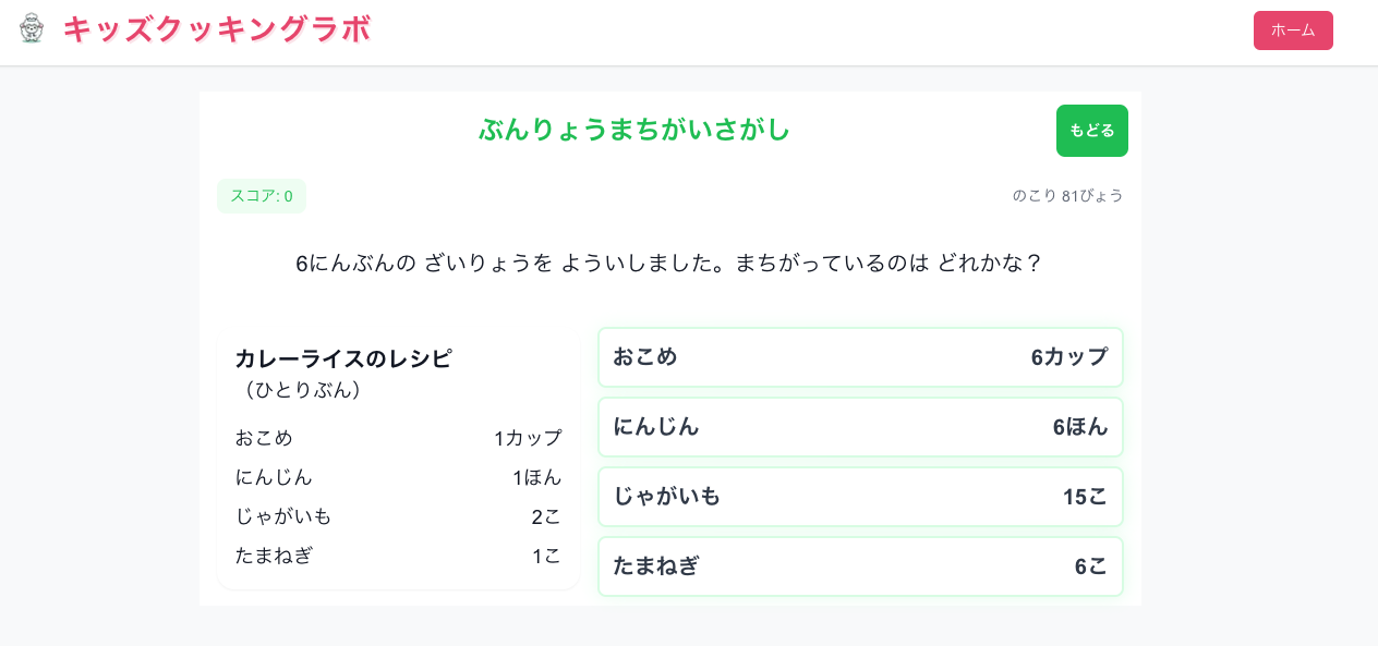 小学1年生娘がiPadのゲームでよく遊んでいますが、「勉強アプリは真面目すぎてすぐ飽きる」「ゲームアプリは時間を消費するだけ」となかなか良いアプリに出会えず、それなら自分で作ろうと開発することにしました。 キッズクッキングラボは「ゲーム形式で料理の基礎と思考力が自然と身につく」を目指しています。 ■コンテンツ 【材料マスター】 ・食材名マッチ:イラストと食材名を一致させる(食材の名称理解) ・食材特徴クイズ:特徴から食材を当てる(食材の特性理解) ・不足食材さがし:レシピと冷蔵庫の食材を照合して不足食材を見つける(観察力) ・買い物ゲーム:レシピを見て必要な食材を選択する(読解力) 【調理器具マスター】 ・調理器具マッチ:器具の画像と名前を一致(道具の名称理解) ・特徴クイズ:用途から適切な器具を選ぶ(道具の用途理解) ・器具取って:調理シーンに合った道具を選択(道具の用途理解) 【分量マスター】 ・分量チャレンジ:適切な計量器具で正確に計る(計量スキル) ・レシピ分量:人数に応じた分量計算(かけ算) ・分量間違い探し:レシピの分量誤りを指摘(かけ算) 【調理マスター】 ・クッキングタイム:工程時間の合計を計算(足し算) ・何時にできる?:調理時間から完成時刻を計算(時計の読み方) ・準備は何時から?:完成時刻と調理時間から開始時刻を逆算(時計の読み方) ・取り分けゲーム:人数で料理を均等に分ける(わり算)
