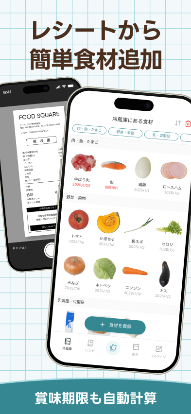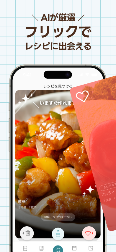 自炊デビューしたけれど、冷蔵庫の管理や献立選びに疲れていませんか? フリレコなら、面倒なことは全部アプリにお任せ!楽しく「食」を管理できます! ● 献立は「スワイプ」で直感的に決める AIがあなたの冷蔵庫にある食材からレシピを提案!あなたは「アリ」か「ナシ」かをスワイプするだけ!直感で選ぶだけで、今日の気分にぴったりのご飯が見つかります。スワイプすればするほど、あなたの好みをAIが学習します! ● 面倒な入力はゼロ。レシートをパシャッ! スーパーのレシートを撮影するだけで、食材がアプリ内の冷蔵庫にずらりと並びます!賞味期限も勝手に入力してくれるから、食材管理のストレスから解放されます。 ● 「あ、これ余ってたんだ」をなくす レシピを作った後は、使った食材をワンタップで消去!冷蔵庫の中身が常にクリアになるので、買い出しの無駄も減らせます。 ● ネットのレシピもひとまとめ インスタやWebで見つけたレシピもURLだけで簡単保存!あちこち見に行く手間がなくなります。 自炊をもっと楽に、もっと楽しく。 今日からフリレコと一緒にキッチンに立ちませんか?