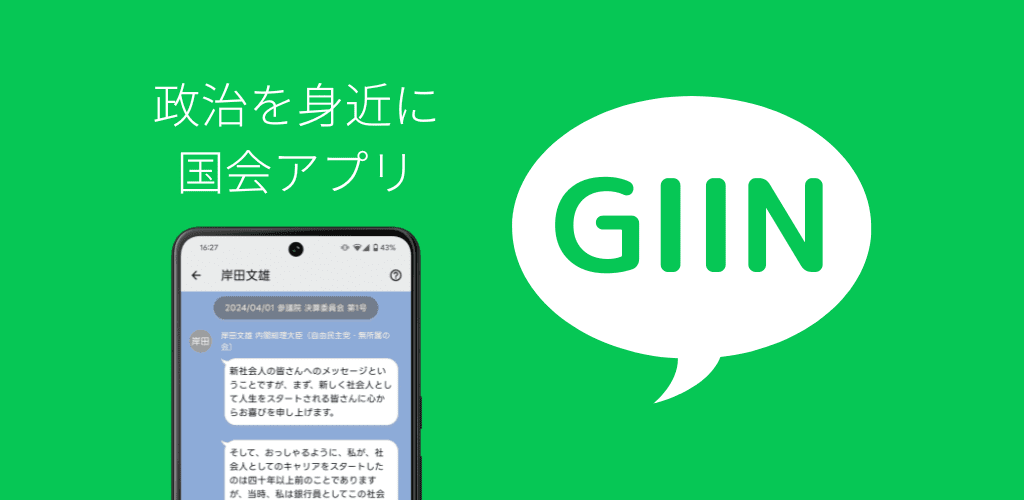 「GIIN」(ギイン)は、議員やワードをフォローして国会議事録の発言を読むことができる国会アプリです。 使い慣れたチャットアプリのような感覚で、メディアやSNSに切り取られた情報ではない、生の発言をいつでも気軽に見ることができます。 完全無料で会員登録も不要です。 ◆ 議員をフォロー 国会議員をフォローして、その議員の発言をすべて見ることができます。 証人や参考人など、政治家以外の発言者もフォローできます。 ◆ ワードをフォロー ワードをフォローして、そのワードが含まれる発言を抽出してチェックすることができます。 気になる話題について、どんな議論が行われているか追うことができます。 ◆ 会議一覧 年月を指定して、会議単位の議事録を見ることもできます。 1947年5月の第1回国会から最新の国会まで、すべての会議を見ることができます。 ※当アプリケーションのコンテンツは、「国会会議録検索システム 検索用API」(国立国会図書館)( https://kokkai.ndl.go.jp/api.html )を加工して作成しています。