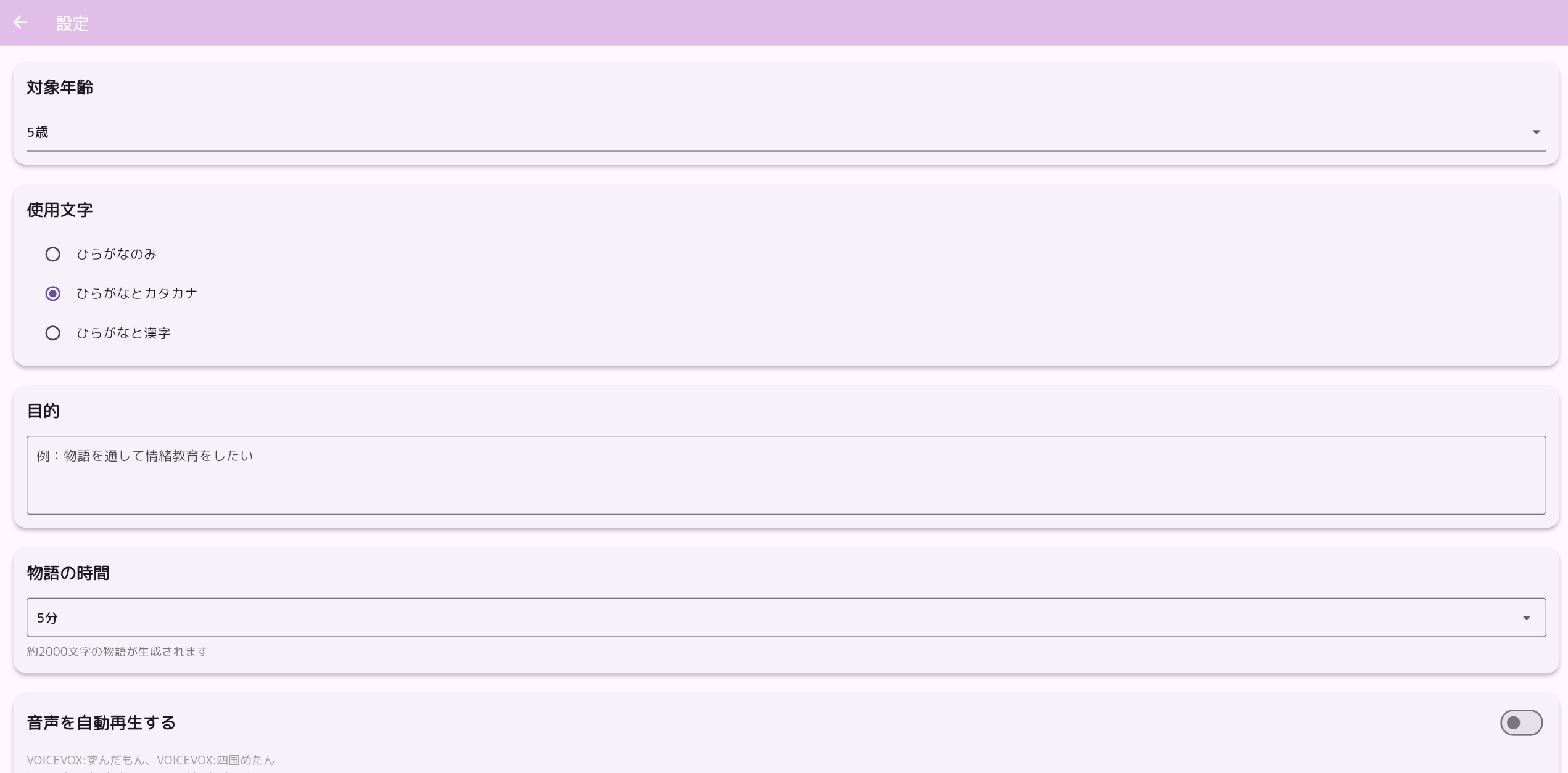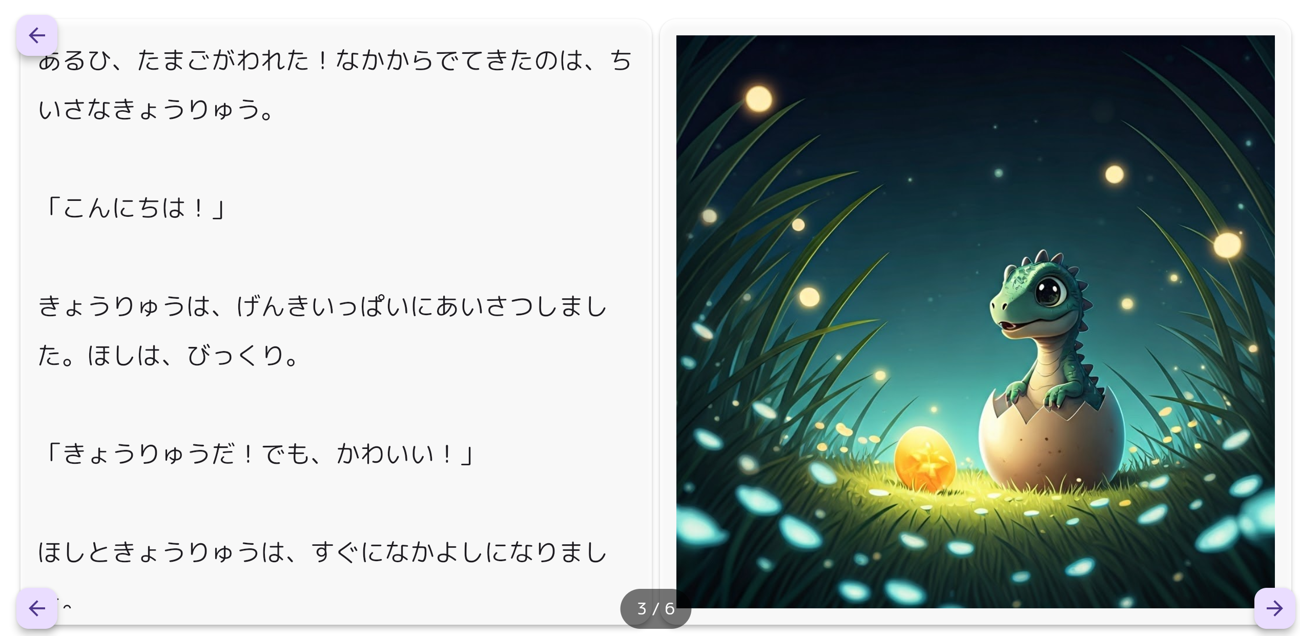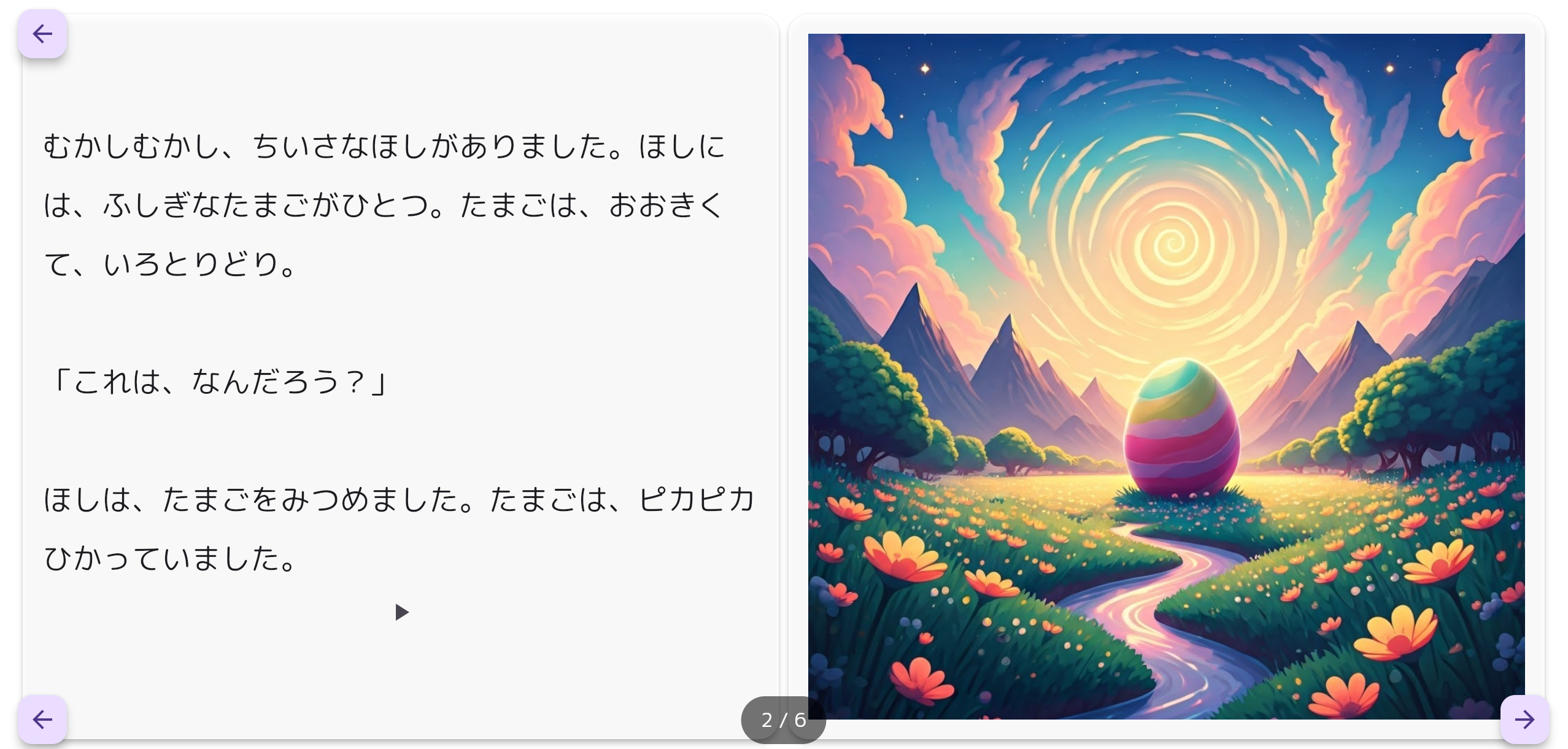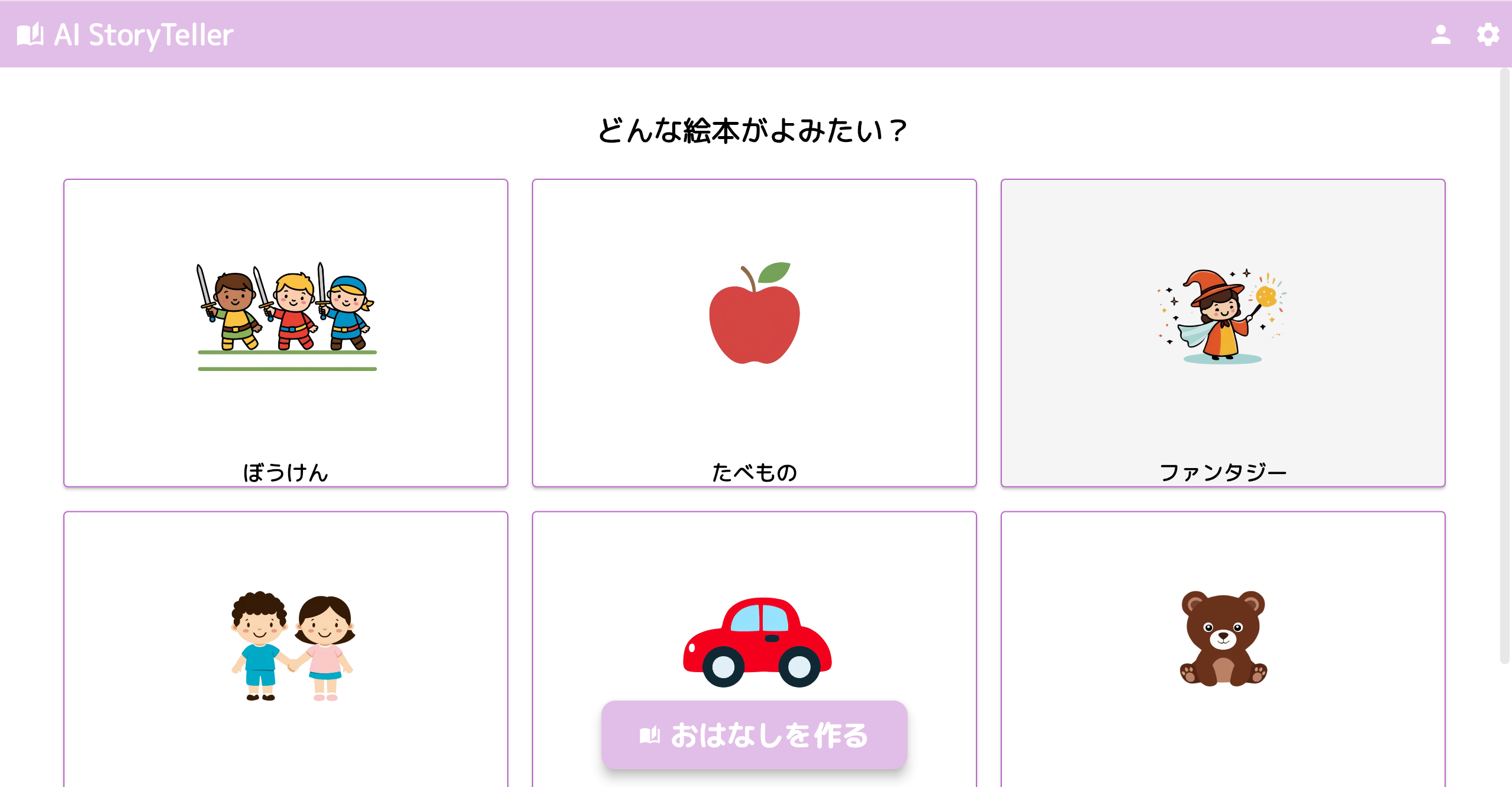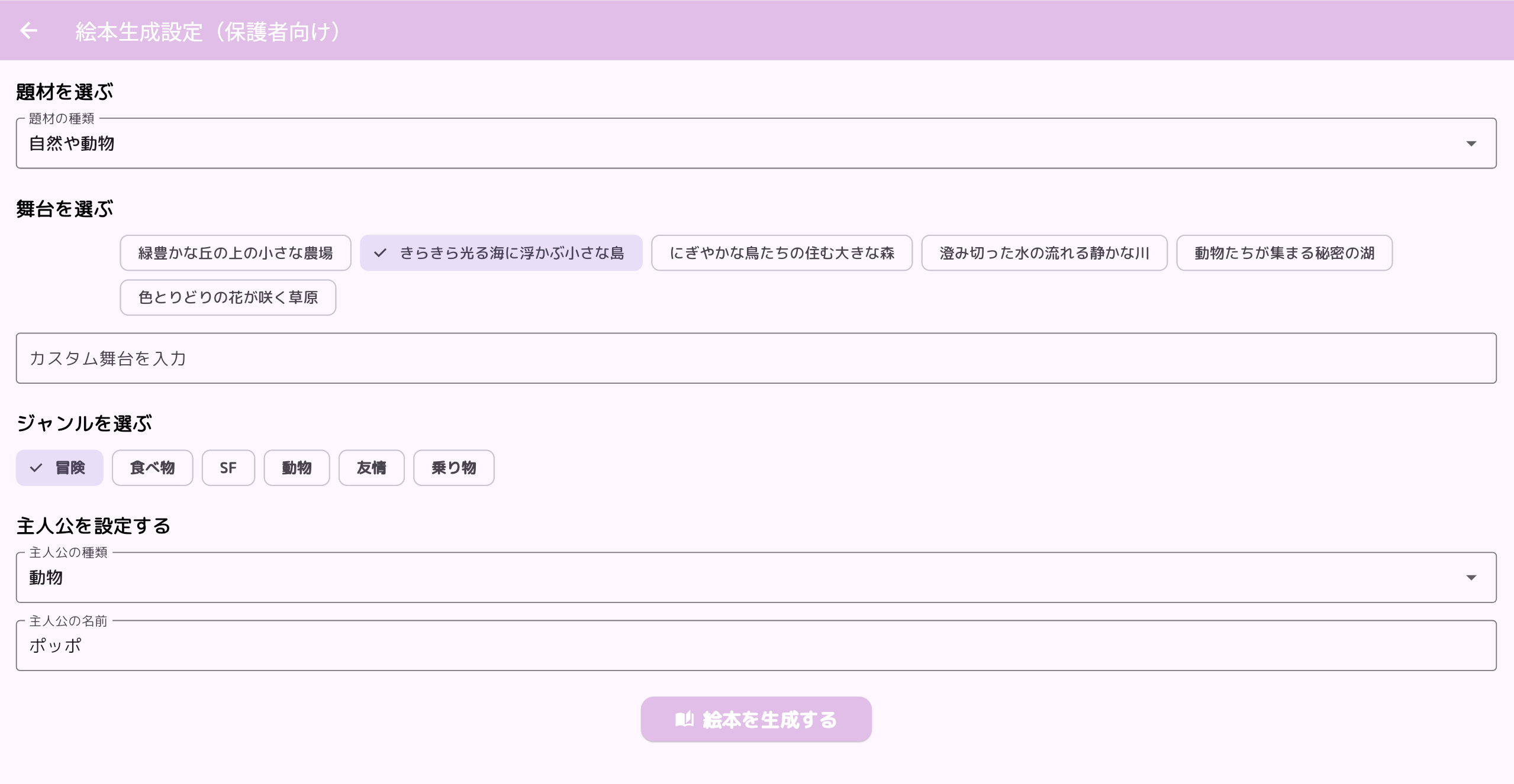 子どもへの色々な絵本を読み聞かせたいけれど、十分な時間がなかったり、絵本は値段が高くて沢山は買えない。。そんな悩みはありませんか? このアプリではGeminiの最新の文章生成・画像生成機能を活用して自分だけの物語を作成し、子どもに読み聞かせすることができます。 子供向け・保護者向け機能が分かれており、子どもは好きなジャンルを直感的に選択して絵本を作ることが出来ます。 保護者向けの機能では、以下を選択して、よりオリジナリティのある絵本を作ることができます。 ・題材 ・舞台 ・ジャンル ・主人公の種類 ・主人公の名前 設定画面では、絵本を生成するときにこの設定がデフォルトとして反映されます。 ・対象年齢 ・使用する文字 ・読み聞かせの目的 ・物語の時間 早速、アプリを利用してまだ見ぬ新しい絵本と出会いましょう! ※API制限のため、生成できる絵本の数は1分間~5分に1回程度です。