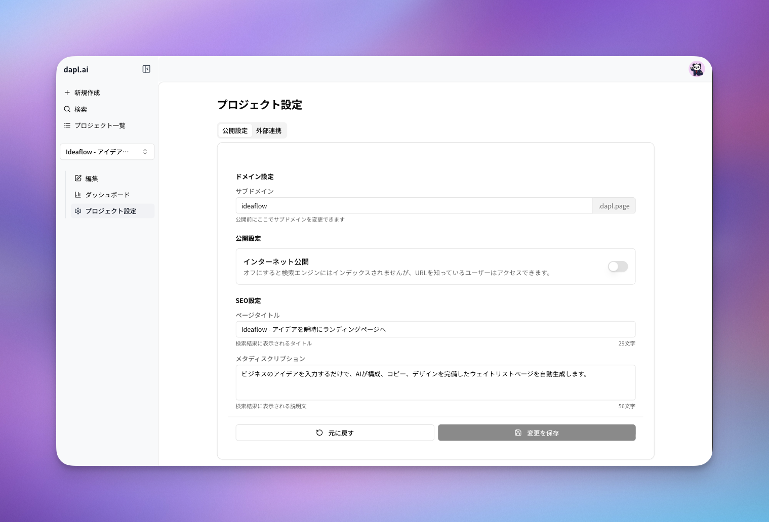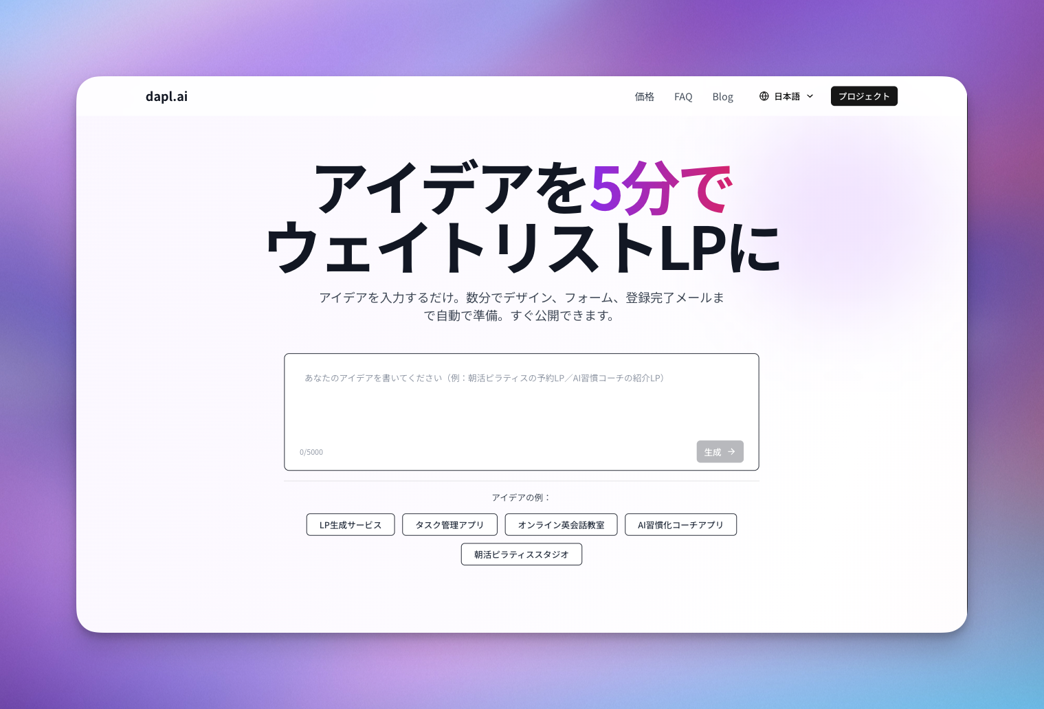 ランディングページを作ってアイデアの検証をしたいがデザインや機能にこだわってしまい、なかなか公開できない...開発に時間がかかってしまう...こんな課題はありませんか? dapl.aiは思いついたサービス・アプリのアイデアを即ウェイトリスト/事前登録機能が搭載されたLPに変換し即公開できるサービスです。 爆速でアイデア検証やリード獲得を開始したい方はぜひご利用ください!