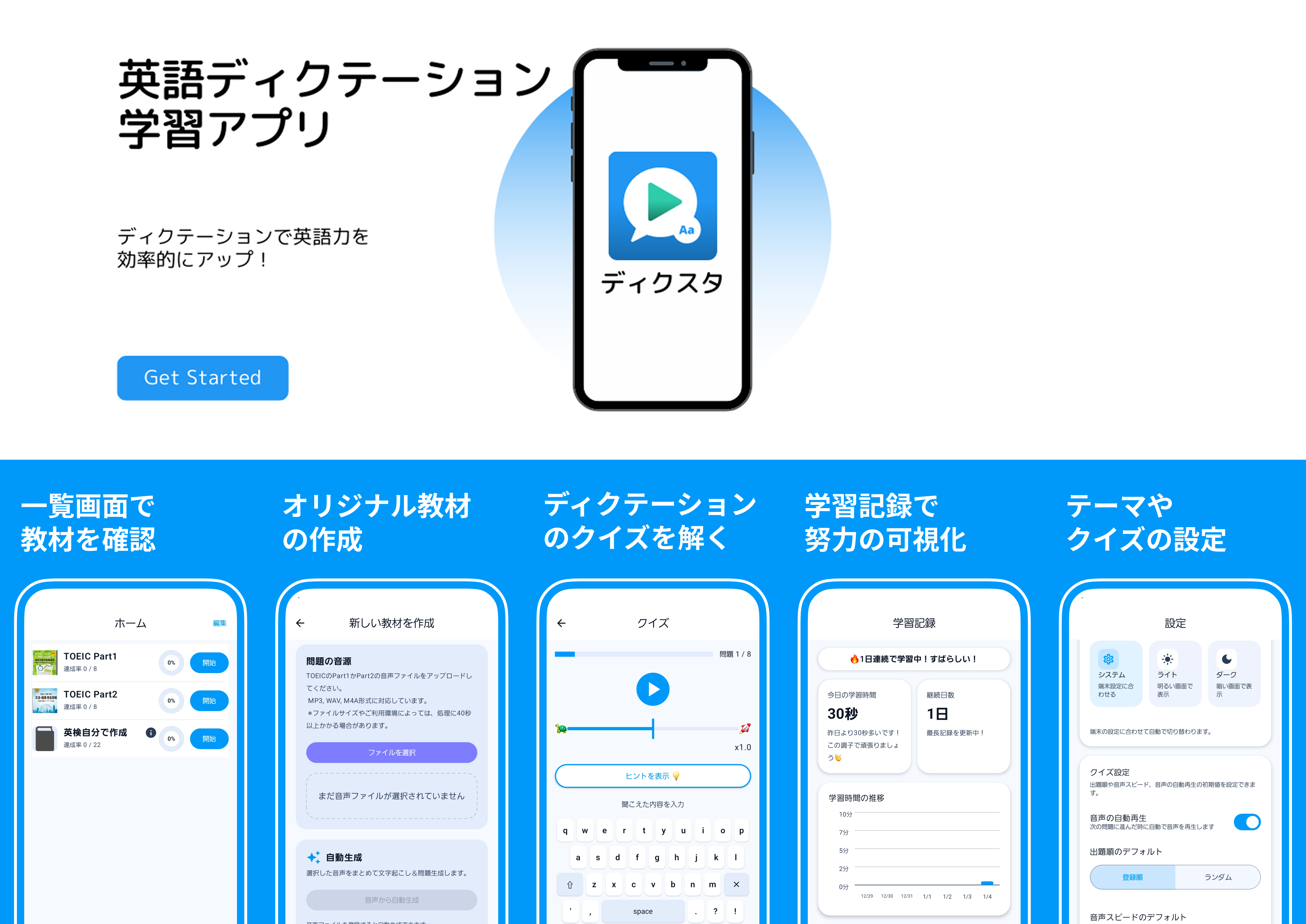 英語ディクテーション学習アプリ「ディクスタ」です。 手持ちのTOEIC音声から問題を作成でき、通勤・通学のスキマ時間で効率的にリスニング力とスペル力を鍛えられます。 さらに、自分で問題を作成することもでき、学習履歴機能で成長の記録も確認できます。