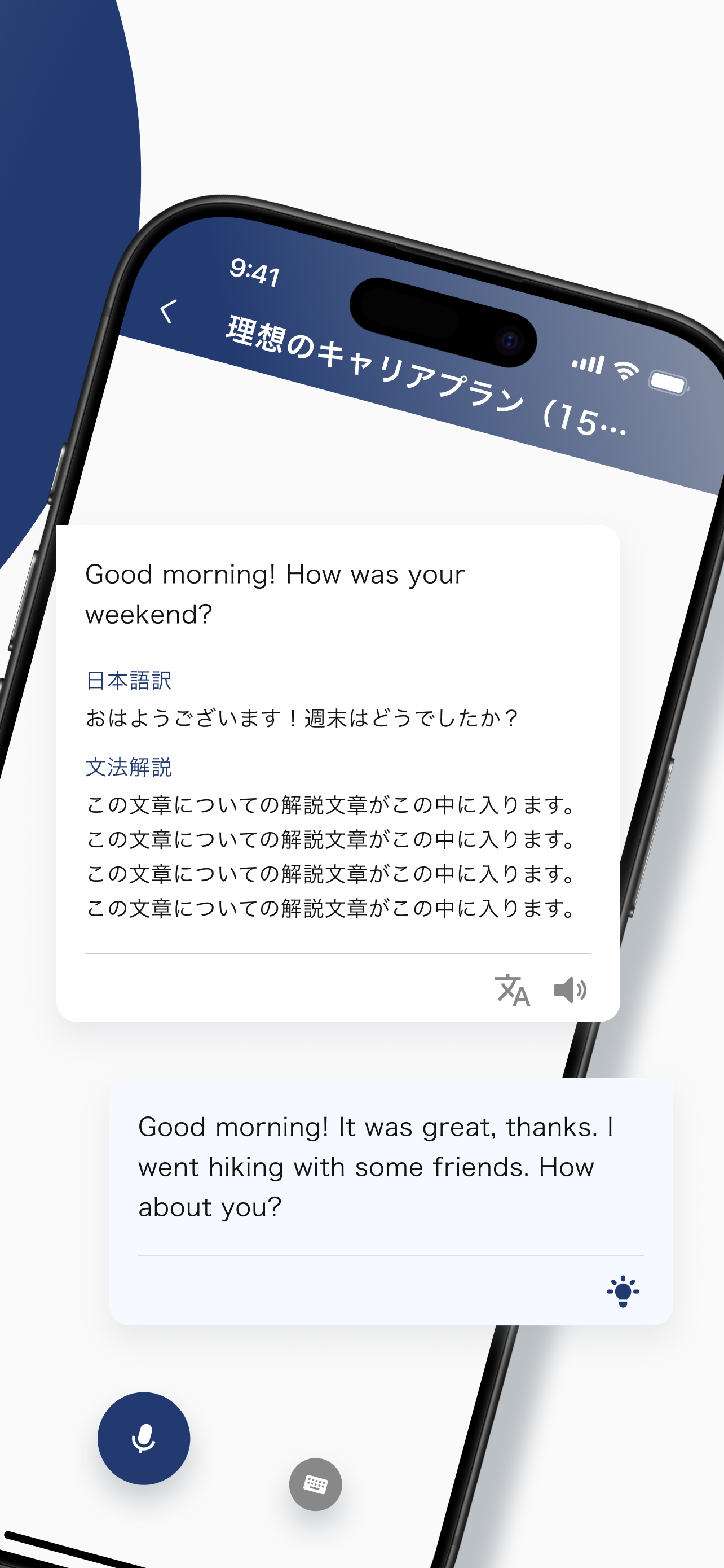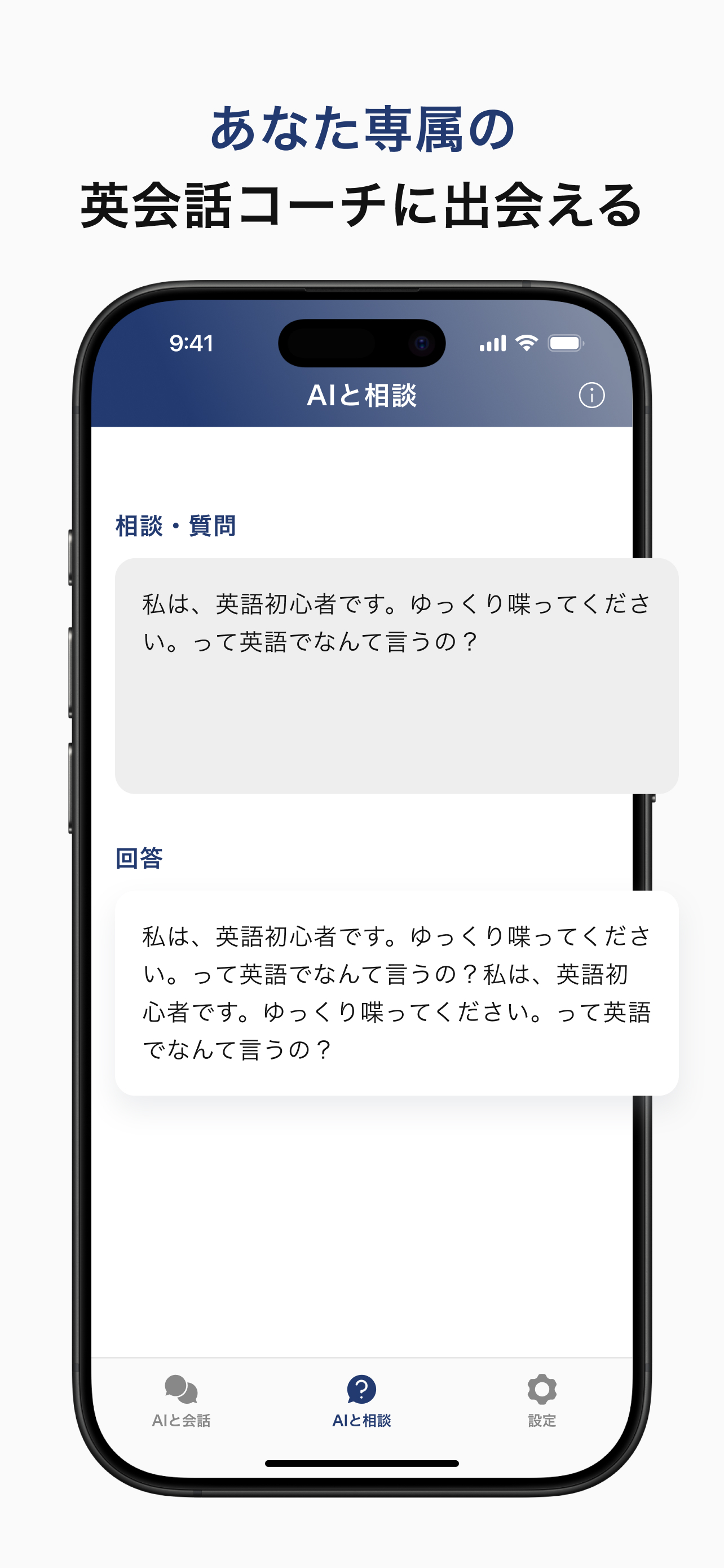 今日から始める独り言英会話アプリ! 通勤中やおうち時間に、自由に決めたシナリオでスピーキング練習。日本語訳&音声質問で疑問すぐ解決! 今日から始める!独り言英会話で英語スピーキング力アップ ◆一人で楽しく続けられる「独り言英会話」アプリ◆ 英語のスピーキング練習を一人で続けたいあなたへ 〜初心者から中級者まで対応の英会話アプリ! 通勤中やおうち時間に、まるでネイティブと話しているかのようなリアルな英会話シナリオで、楽しく続けられる「独り言英会話」を体験しましょう。 ■こんな悩みを解決します ・英語を話す機会がなくて、スピーキング力が伸びない。。。 ・英会話で聞き取れないとすぐ諦めてしまう。。。 ・自分の英語が合っているか不安。。。 ・「こう言いたい!」がパッと思い浮かばない。。。 ■主な特徴 ・シナリオ&役割設定で本格英会話練習 カフェ、旅行、ビジネス…好きなシチュエーションと登場人物を選んで、AIとリアルな英会話練習が可能。独り言英会話で自然な英語表現を身につけましょう。 ・聞き取れないときは日本語訳サポート 英会話の一部が分からなくても大丈夫。ワンタップで日本語訳を表示して、理解を即サポート。 ・発音&表現をワンランクアップ あなたが喋った英語を自動解析。正しいかチェックし、より自然な表現や言い回しをアドバイス!独り言英会話で確実にスピーキング力が向上します。 ・音声質問で瞬時に回答 「こういうとき英語で何て言うの?」をすぐ解決!音声で質問すれば、AIが回答します。英会話の疑問をその場で解決できます。 ■こんな方におすすめ ・毎日コツコツ独り言英会話でスピーキング習慣をつけたい ・英会話スクールに行く時間がない ・人前で話すのはまだ緊張…まずは一人で練習したい ・英語で自由にコミュニケーションできるようになりたい ・ChatGPTなどで英会話練習は、毎回プロンプトをタイピングするのが面倒 ■使い方カンタン3ステップ 1.シナリオと役割を選ぶ 2.AIと英語で会話スタート 3.日本語訳&表現アドバイスで復習 いますぐダウンロードして、いつでもどこでも「独り言英会話」で効率的に英語のスピーキング力をアップしましょう! あなたの英会話デビューを全力サポート!