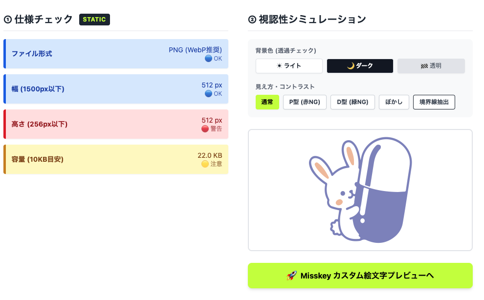 Misskey.ioのカスタム絵文字制作に便利な 画像仕様&視認性チェッカーを作りました! ・PC、スマホ対応 ・サーバー送信なし ・登録不要 ・コントラスト自動抽出 ・視認性シミュレーション