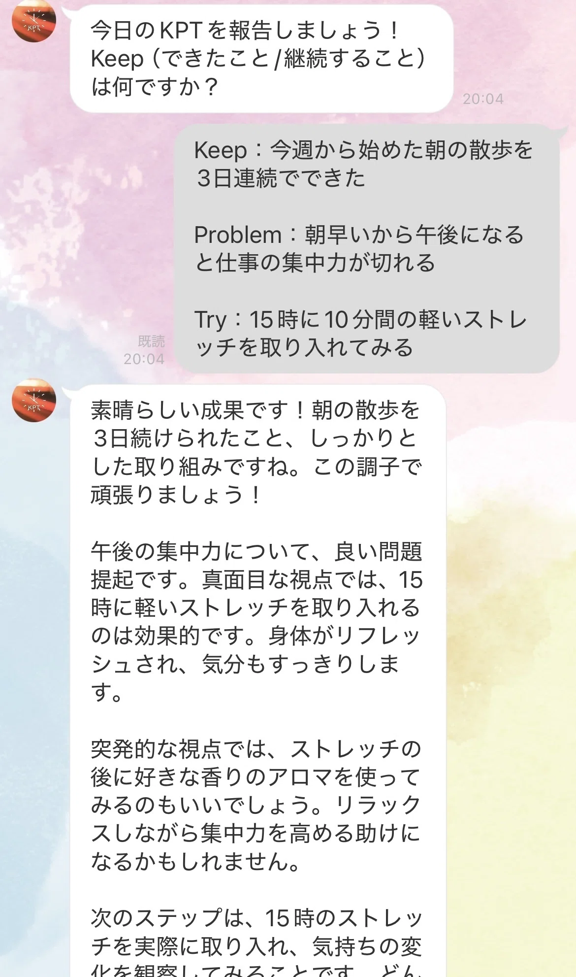 LINEで毎日気軽にKPTを報告し、高性能AIからフィードバックを受け取れるサービス