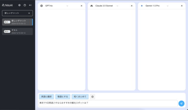 NitoAIでは様々なAIに一度に質問ができ、別々にやり取りする手間も料金も節約出来ます。