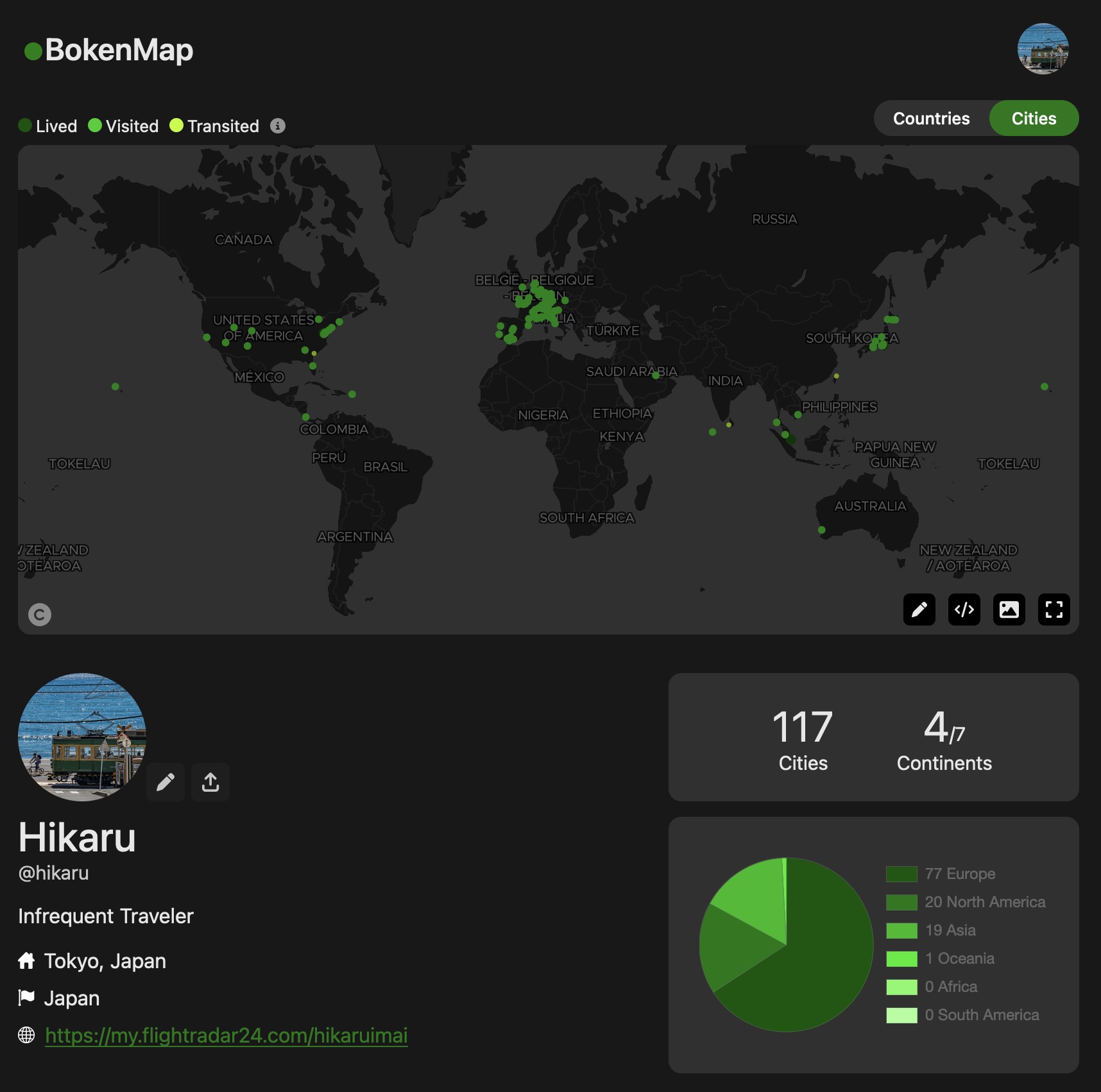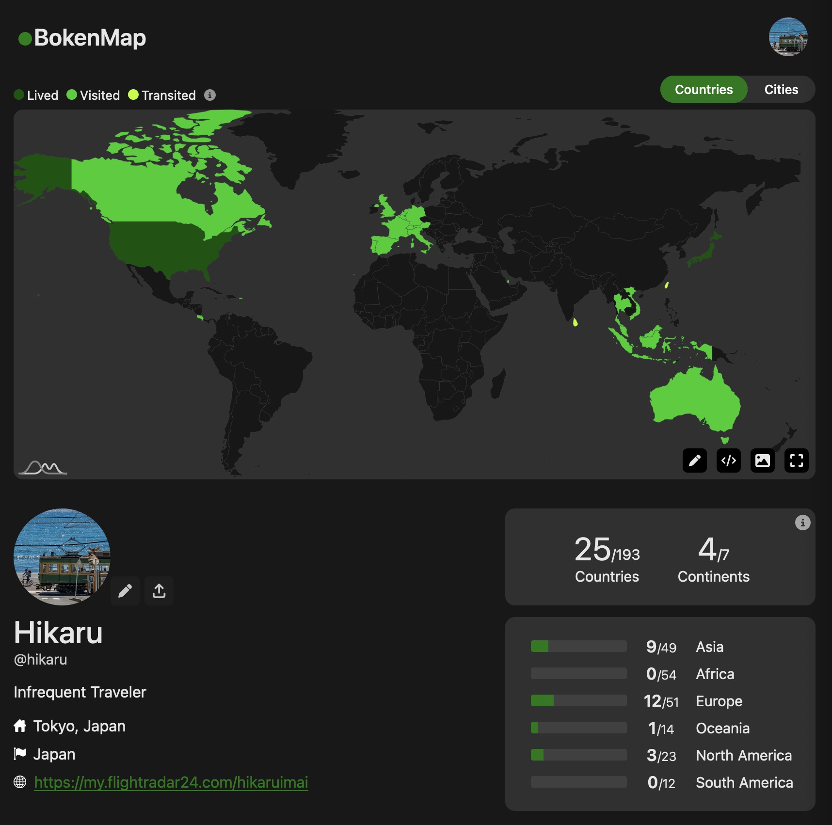 行ったことのある国や街を記録していくツール。地図を画像としてダウンロードしたり、自分のブログやホームページに埋め込んだりすることができます。