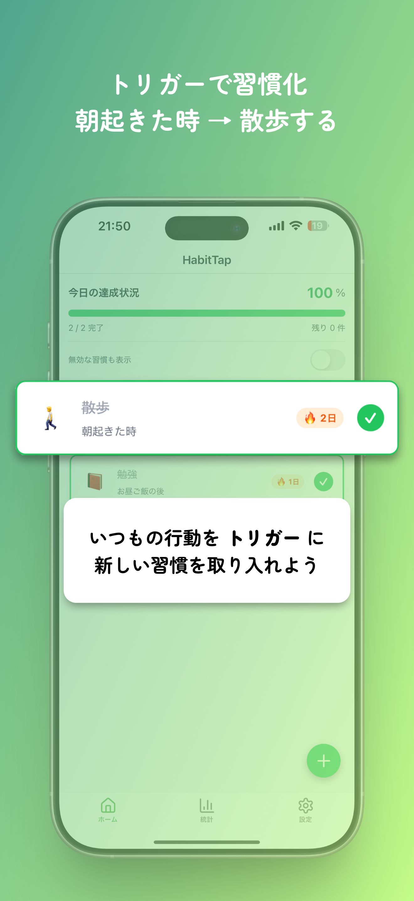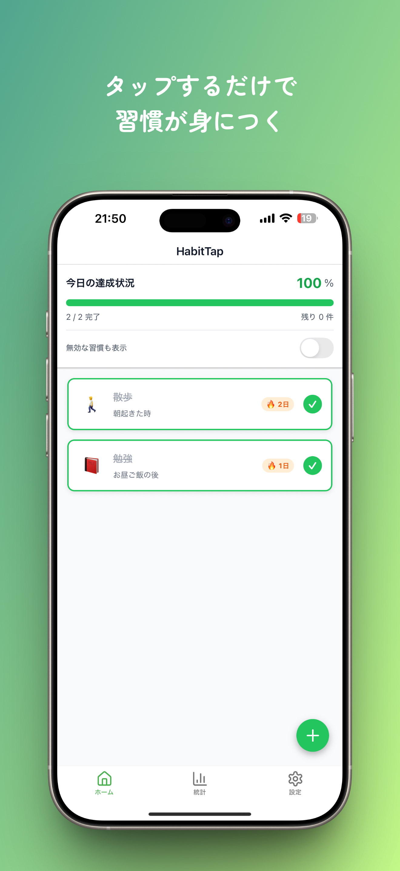 iOS版アプリ リリースされました! https://apps.apple.com/app/habit-tap/id6747366699 Habit Tapは「タップするだけ」という究極のシンプルさで習慣化をサポートします。 行動科学に基づいたトリガー設定により、 - 朝起きたら水を飲む - 昼食後に散歩する など、きっかけと習慣をセットで管理。 ホーム画面のウィジェットは時間経過とともに色が変化し、緑→黄→オレンジ→赤と緊急感を演出。 「今やらないと!」という適度なプレッシャーで行動を促します。