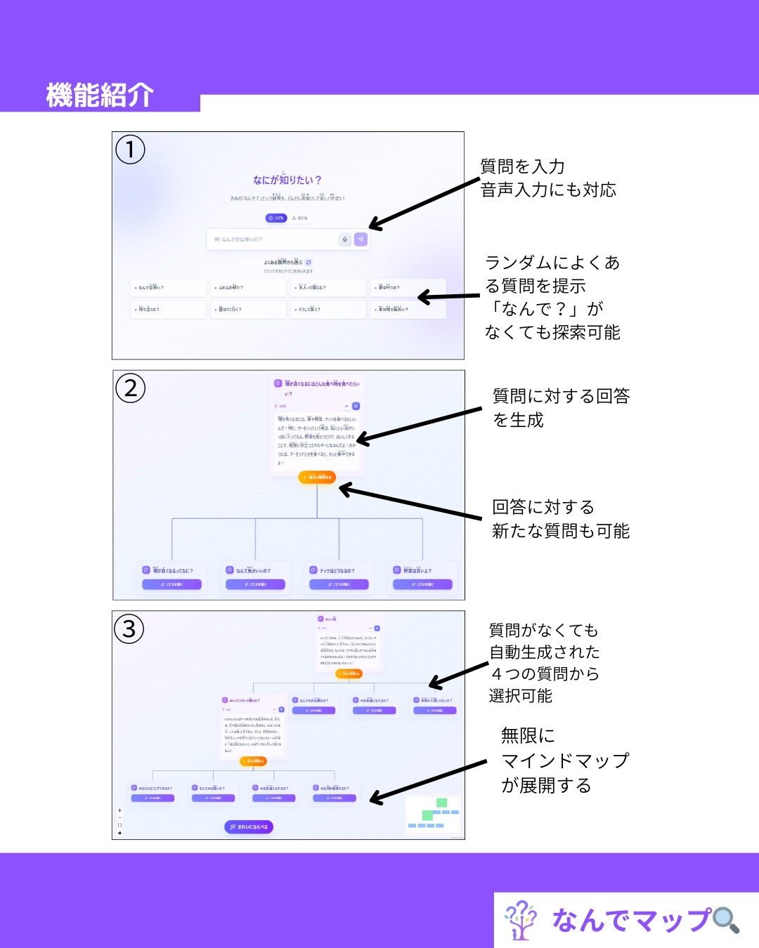 なんでマップは、子どもの「なんで?」を起点に、AIとマップUIで思考を広げていく探究学習ツールです。 1つの質問に1つ答えて終わるのではなく、関連する疑問をつなげて可視化することで、知識のつながりを“線”ではなく“地図”として理解できます。 このプロダクトは、僕自身の原体験から生まれました。 子どもの頃から「なんで?」を大人に何度も聞いて、親や先生を困らせることがありました。 多くの場合は「今忙しいから後でね」で会話が終わり、せっかくの好奇心が途中で止まってしまう。 僕は理解できるまで調べる癖があったけど、普通はそこで諦めてしまう。 その“知的好奇心の機会損失”をなくしたい、という想いが開発の出発点です。 マップ形式にしている理由は明確です。 「今どの話をしているのか」「どこから興味が広がったのか」「次に何を考えればいいのか」が視覚的にわかるため、子どもが迷子にならずに思考を続けられます。 これは単なる回答アプリではなく、考えるプロセスそのものを育てる設計です。 また、AIには何回聞いても怒られない。 だから子どもは遠慮せず、納得するまで問い続けられる。 「当たり前」を疑い、「これっておかしくない?」と考え、必要なら反論できる力まで育てたいと考えています。 なんでマップのビジョンは、 すべての子どもが「なんで?」を恐れずに言える世界をつくること。 知的好奇心と問題解決能力を、日常の中で自然に伸ばせる環境をテクノロジーで実現していきます。