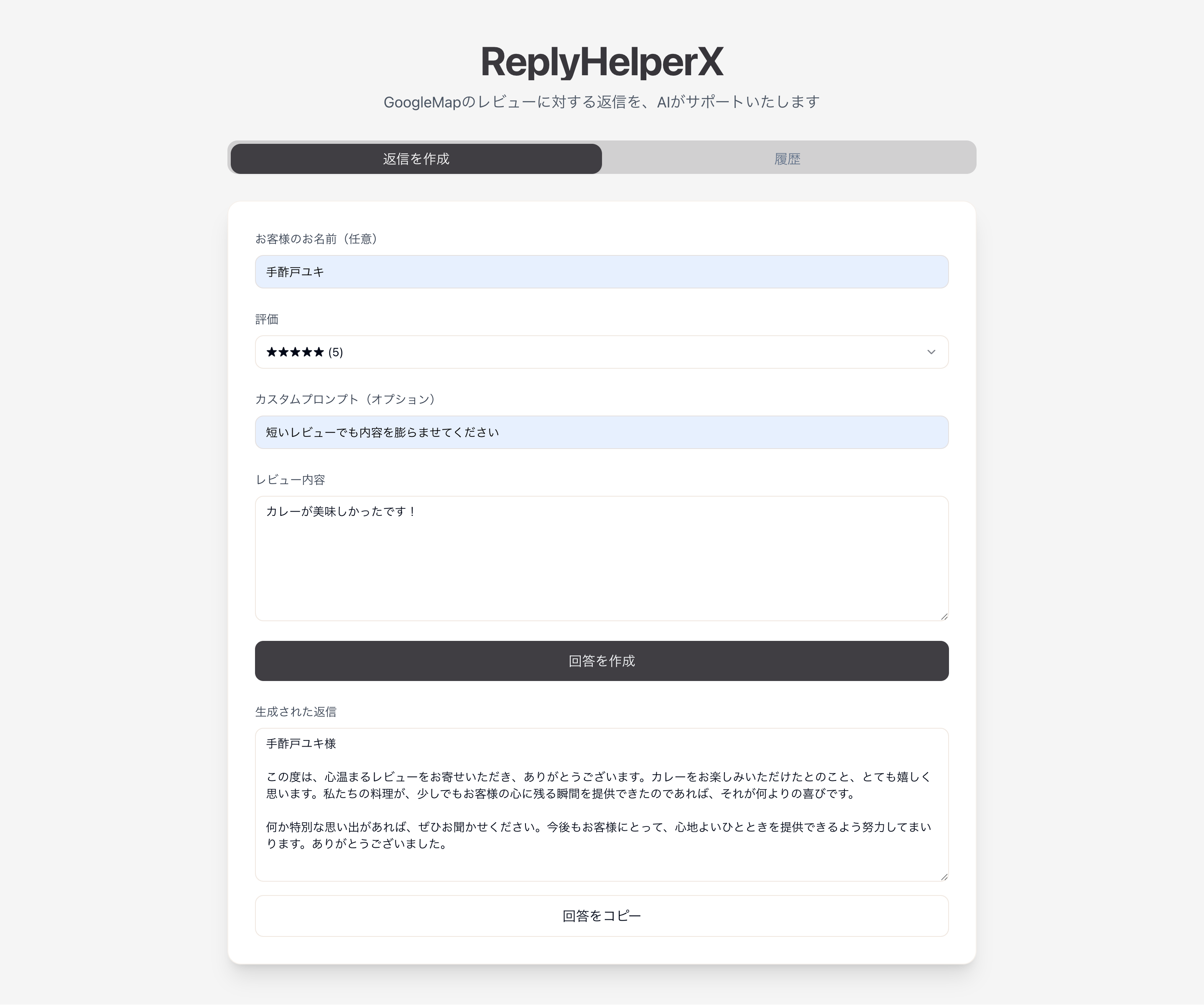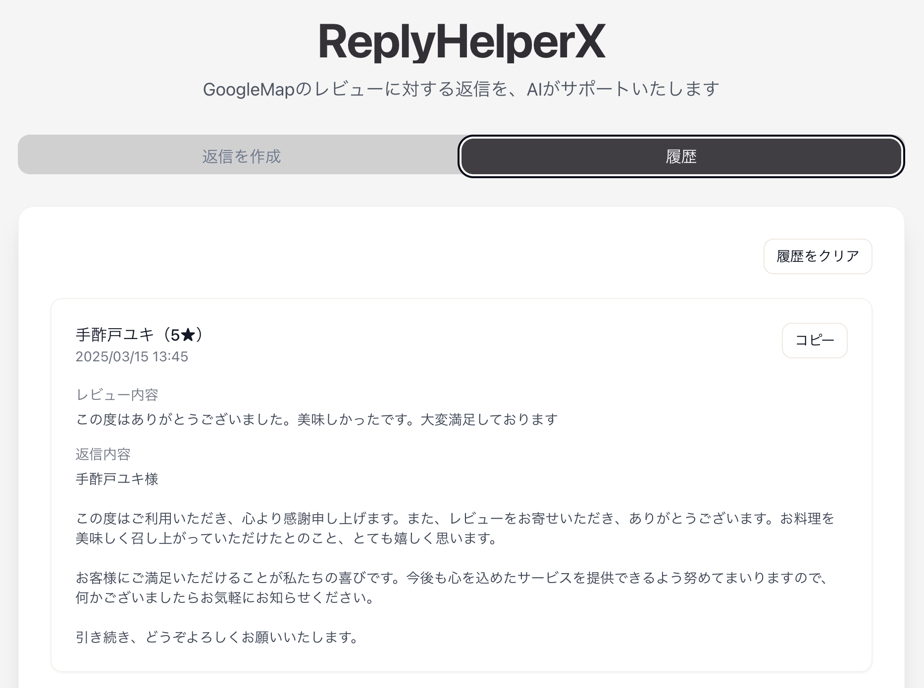 GoogleMap等のレビューに対する返信を、AIがサポートいたします。口調は丁寧すぎるくらいに設定しています。 履歴はブラウザベースで保存されます。