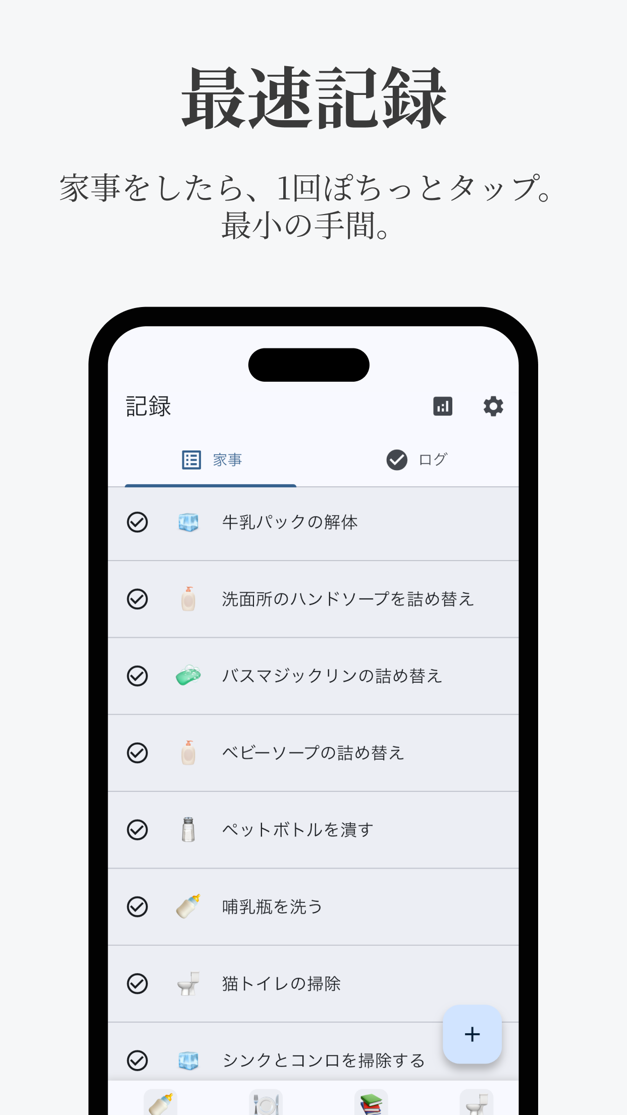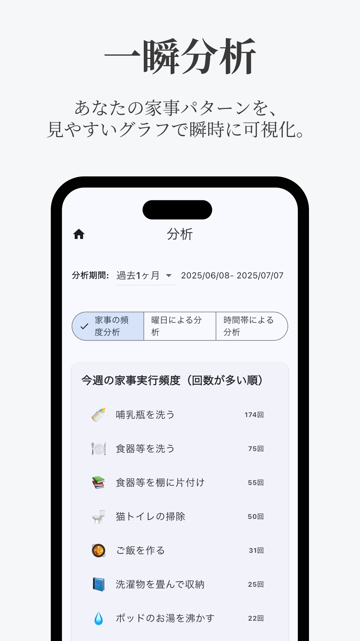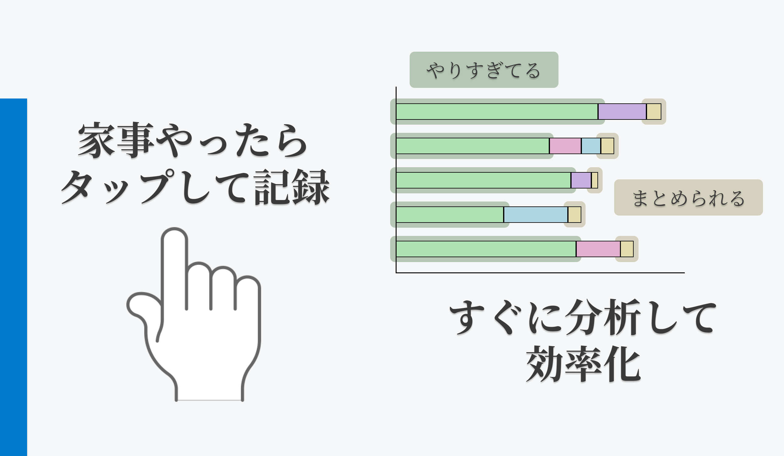 「日々の家事に追われ、やりたいことができない!」 そんなあなたを救いたい気持ちから生まれたアプリです。 「ぽちそぎ」を使って家事を記録し、分析することで、やりすぎている家事を削減することができます。 こんな方におすすめ: 1. 子育て中で時間に追われている主婦/主夫 家事に時間を追われていて、子どもやパートナーと過ごす時間や趣味の時間がなかなか取れない。 2. 効率化にこだわりたいカップル タスク管理や効率化が好きで、少ない労力でできるだけ生活の質を上げたいと考えている。