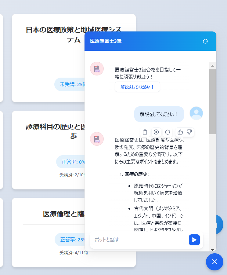 AIラーニングは、AIとのリアルタイム音声対話学習などの最新の生成AIをサイト内に複数導入した、業界最大級の受験対策学習ポータルです。豊富な問題集を解きながら、AIにテキストと音声会話ベースでリアルタイム・深堀質問することができ、学習効率を飛躍的に向上させます。 AIラーニングの科目第一弾は医療経営士3級資格試験対策ポータルです。今後、AIや医療業界を中心に多くの受験や資格試験の学習をサポートして参ります。