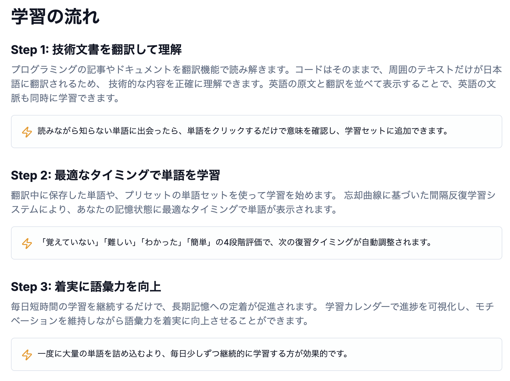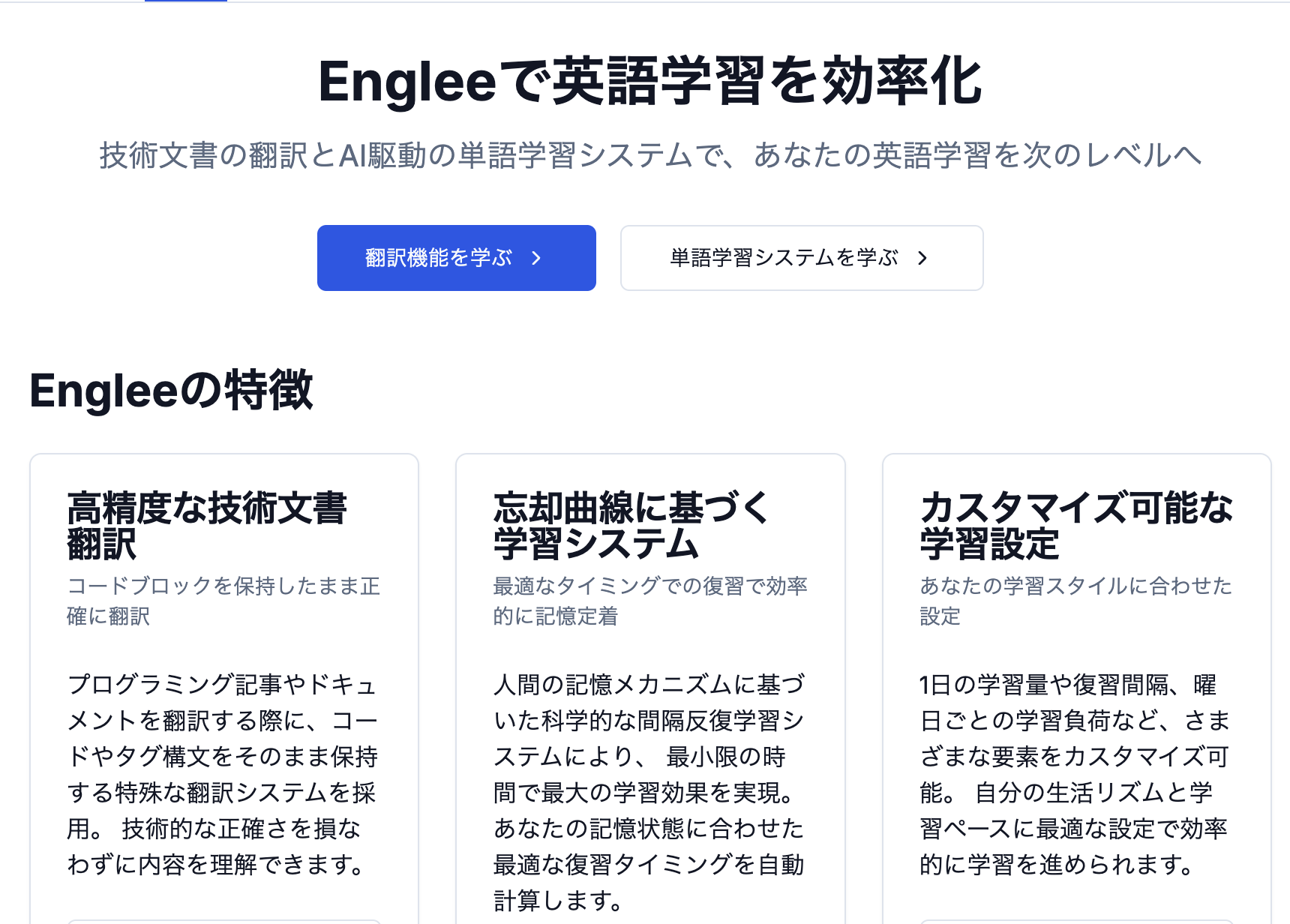 ・英語サイトをAIで高精度翻訳 ・左右ペインで対応翻訳ハイライト ・確認した単語はそのまま単語帳に保存 ・忘却曲線に基づいた学習システム