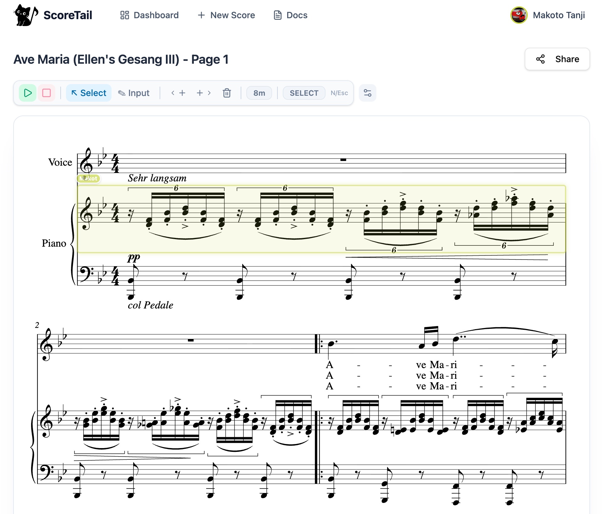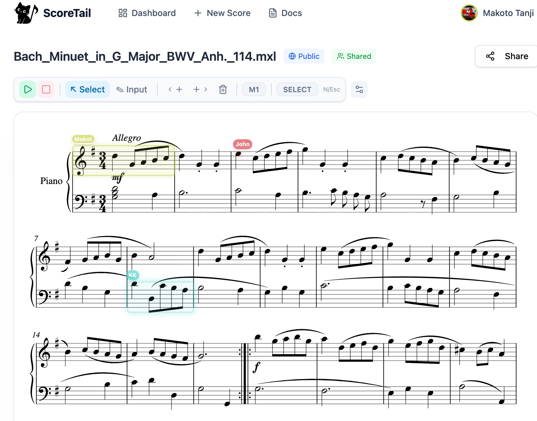 ScoreTail は、楽譜を“楽しくつくる”ための共同編集エディタです。 リアルタイムで同じ楽譜を見ながら、音符の追加・編集・再生までをスムーズに行えます。難しい操作は一切なく、音楽の再生、直感的な編集画面と軽快な動作で、楽しい音楽サービスを目指しています。 ひとりで作曲するときも、仲間とアレンジを練るときも。 ScoreTail があれば、音楽づくりの時間がもっと自由に、もっと楽しくなります。