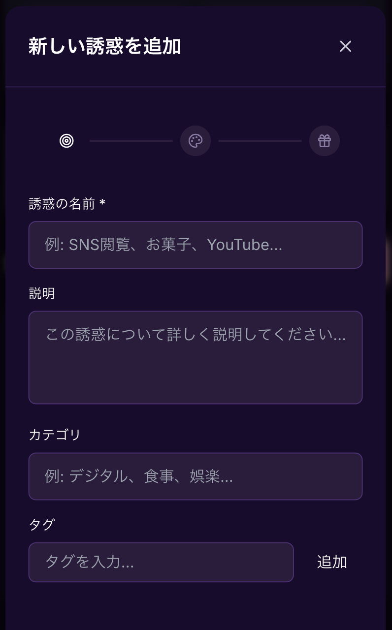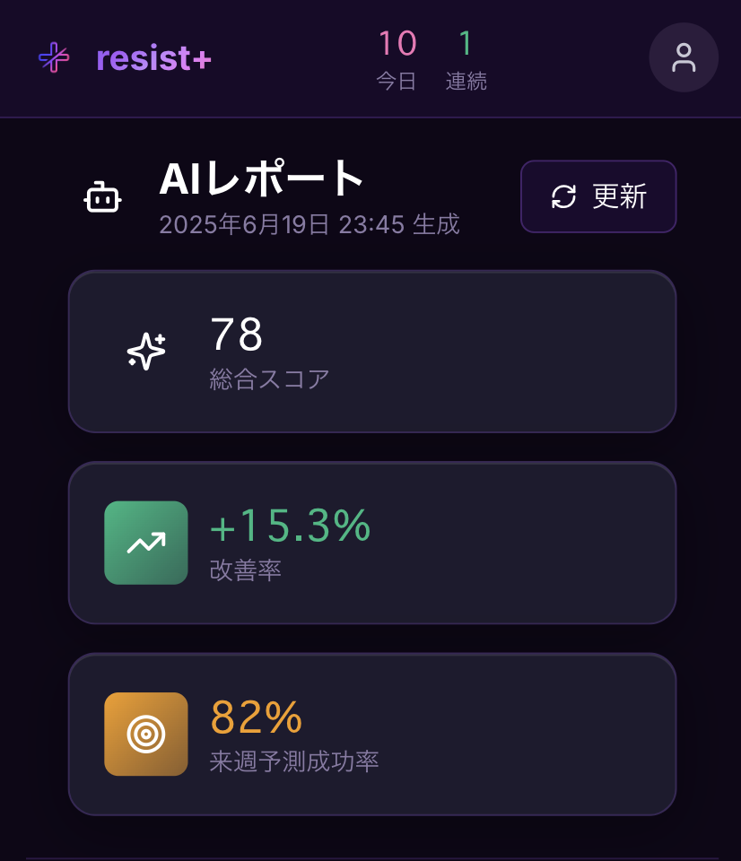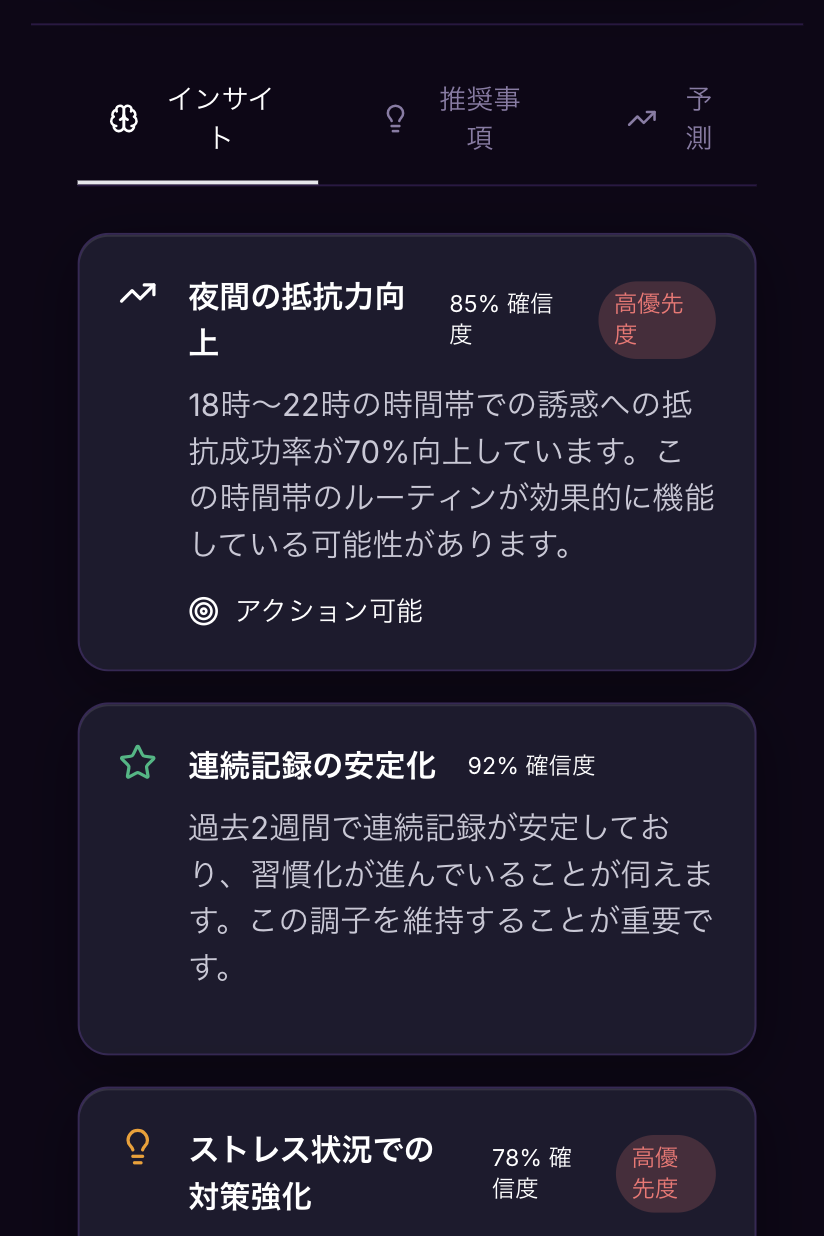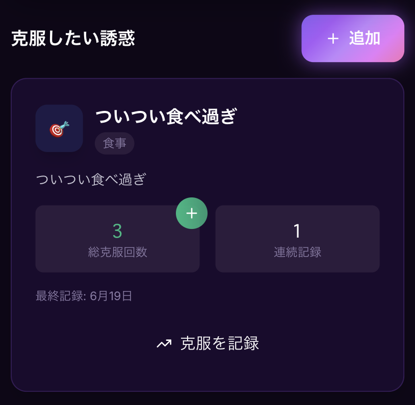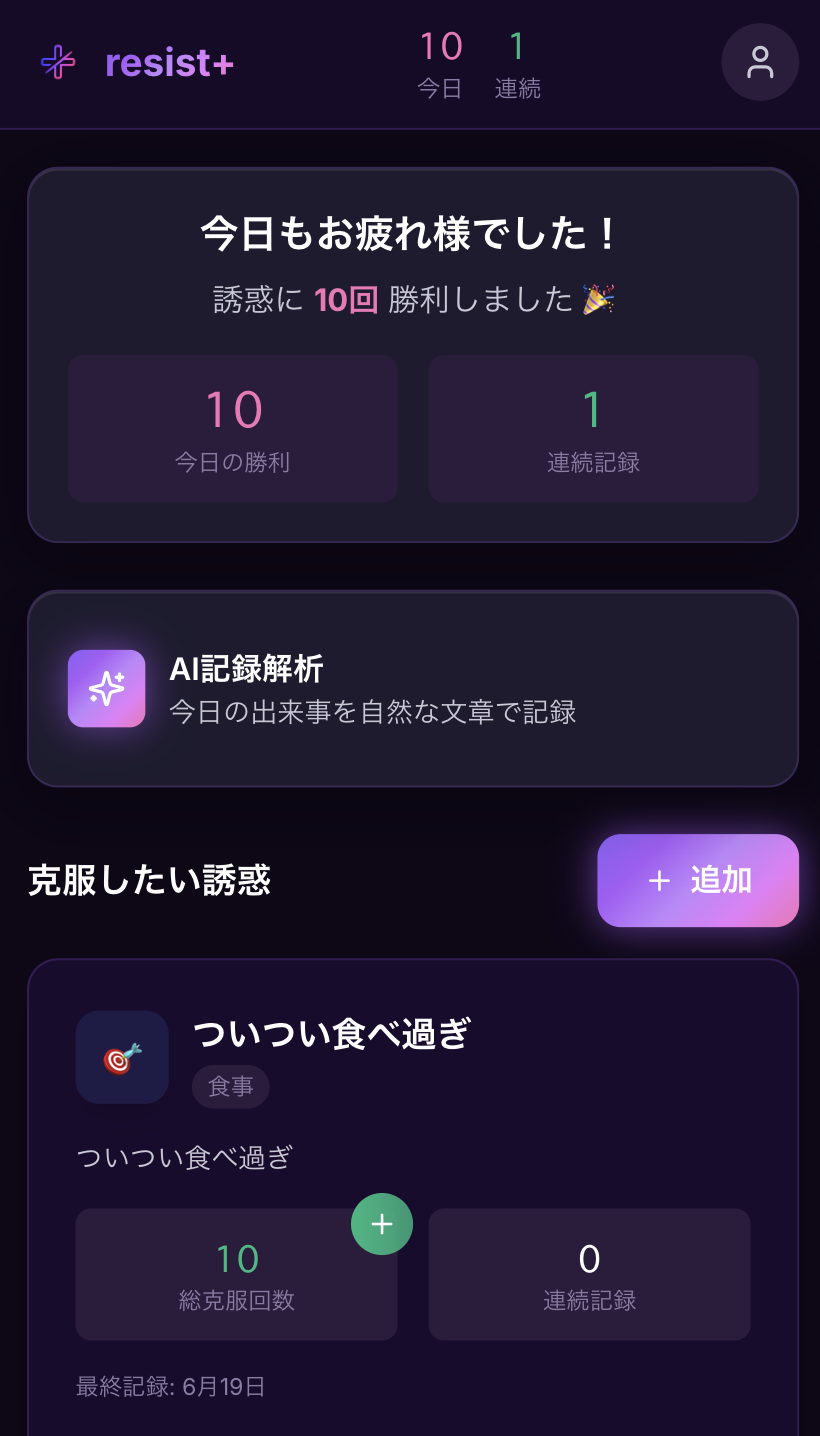 ついついやってしまう悪習慣、一度やったらもういいやとなっていませんか? そんなあなたもその一度の前に何度も誘惑と戦って勝利しているはず。 そんなあなたの頑張りに目を向けて悪習慣と戦うサポートをします! 機能 - 日々の誘惑への抵抗カウント機能 1日単位でなくその日の抵抗した記録をワンボタンでカウントできます! - 誘惑設定は個人で自由に登録 「ついスマホを見てしまう」 「マイナス思考をしてしまう」 「ダイエットしたいのにお菓子を食べる」 など人によって悪習慣は様々のため、自由に登録できます! - 記録機能 抵抗への気づきであったり、その日の日記感覚で記録をつけることができます! - グラフ機能 日、週、月など様々な期間で抵抗への数字を可視化します! - AI分析レポート AIによる習慣の分析レポートにより傾向を可視化してあなたの悪習慣改善をサポートします!