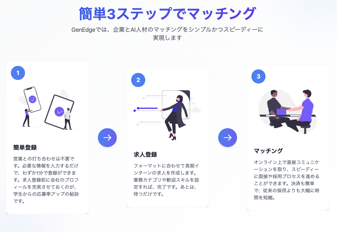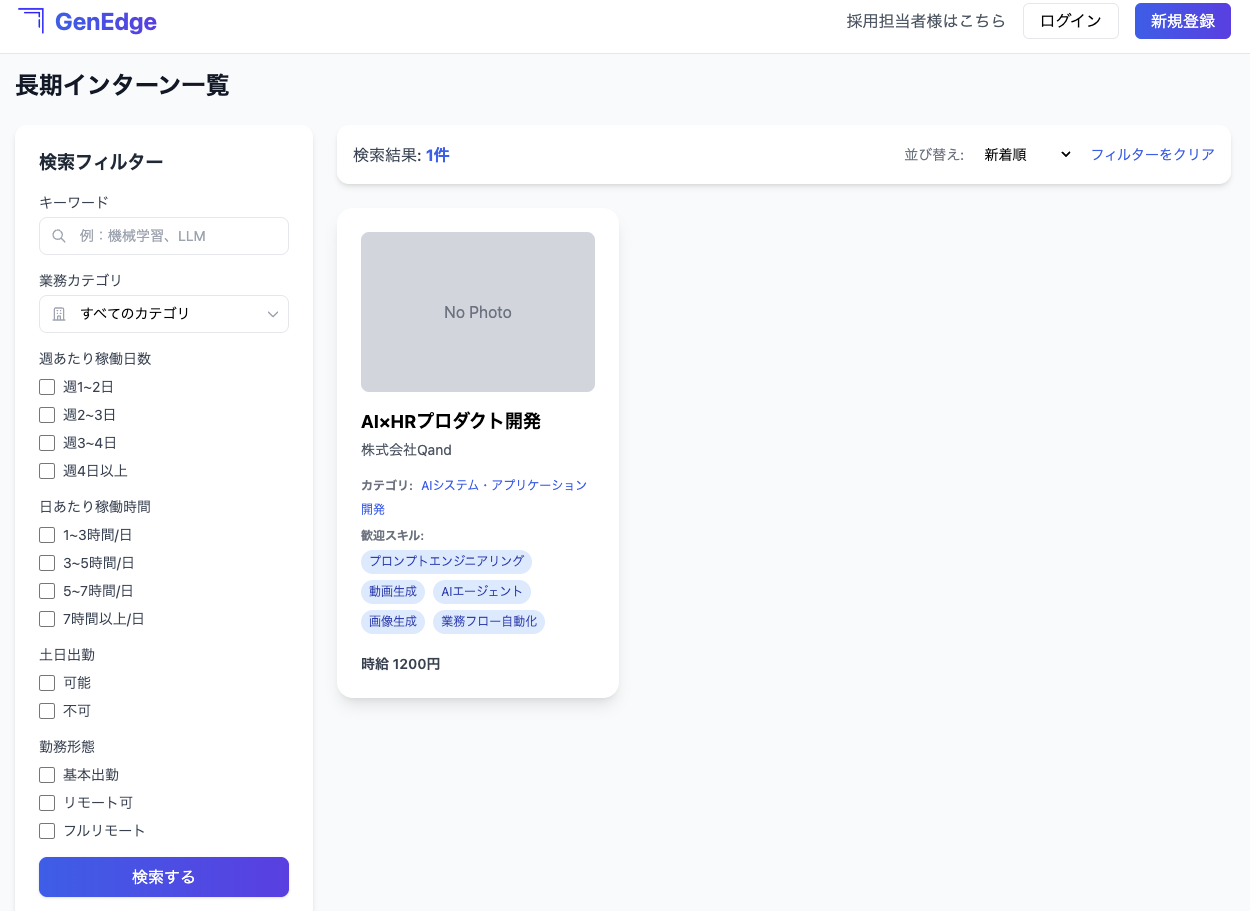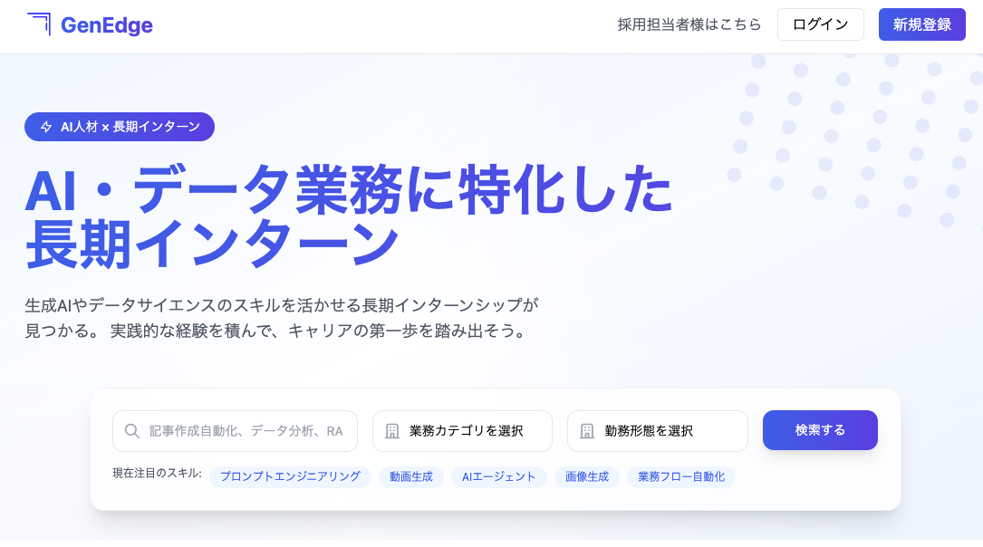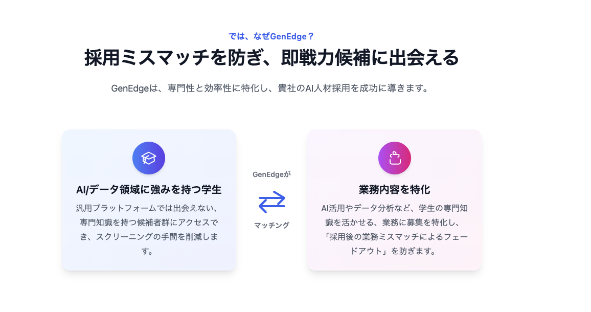 AI活用やデータサイエンス案件など、大学生の専門性を活かせる領域に案件を特化させた、長期インターンプラットフォームです。汎用プラットフォームでは出会えない、専門知識を持つ候補者群にアクセスでき、採用担当者のスクリーニングの手間を削減すると同時に、AI活用やデータ分析など、学生の専門知識を活かせる、業務に募集を特化し、「採用後の業務ミスマッチによるフェードアウト」を防ぎます。ぜひ求人登録+応募してみて下さい!!!!