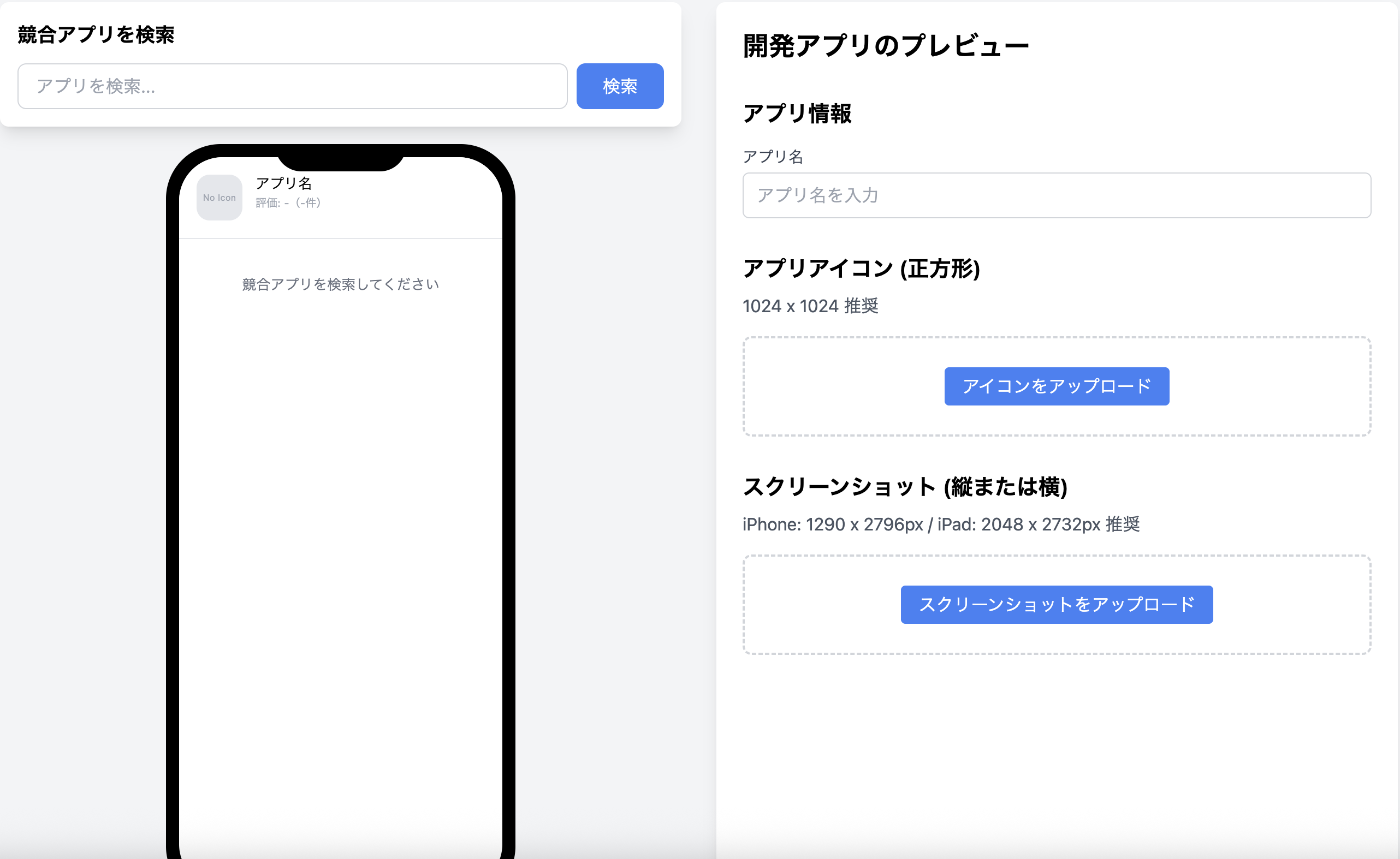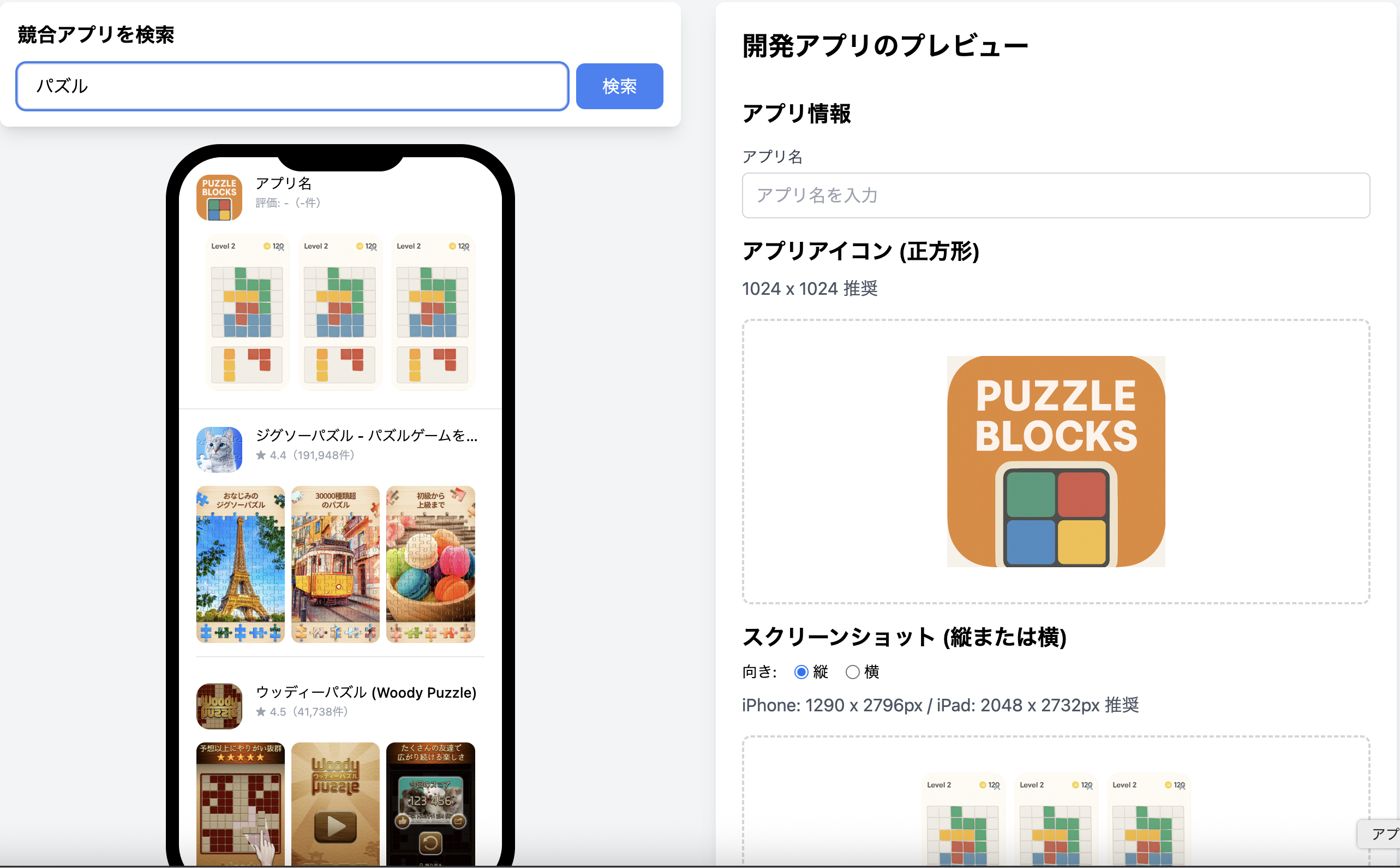 アプリを開発、公開する前にストア画面を作って競合アプリと比較できる開発者向け用ツールです。 Figmaで作ったスクリーンショットだと気づかない文字の小ささ、競合アプリの配色やスクリーンショットと並べて目立つように作れているか確認ができます。