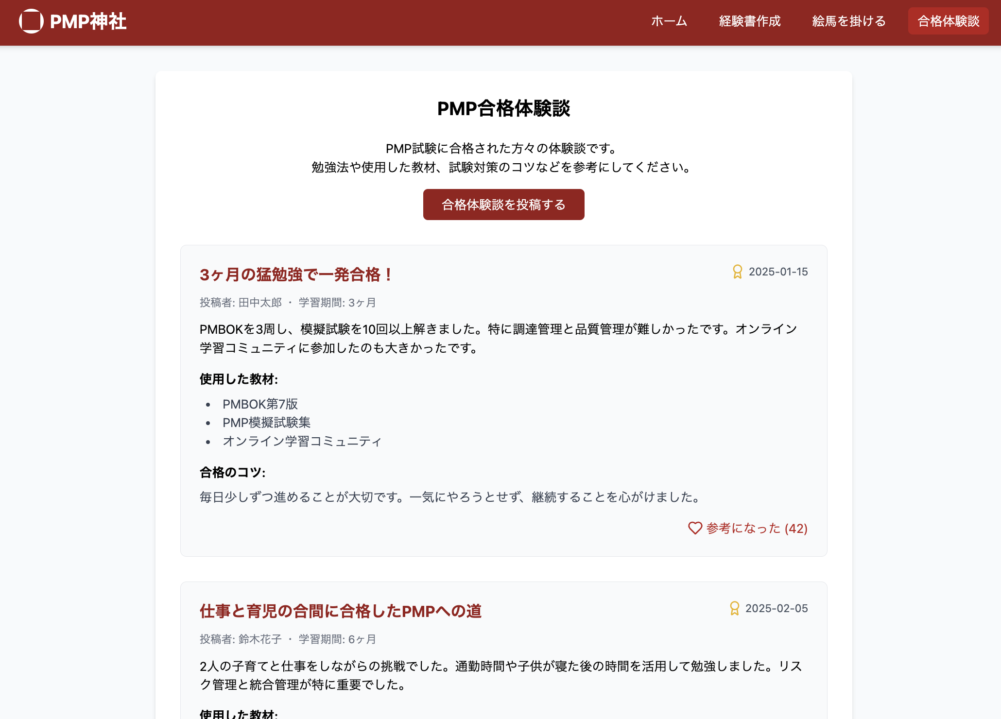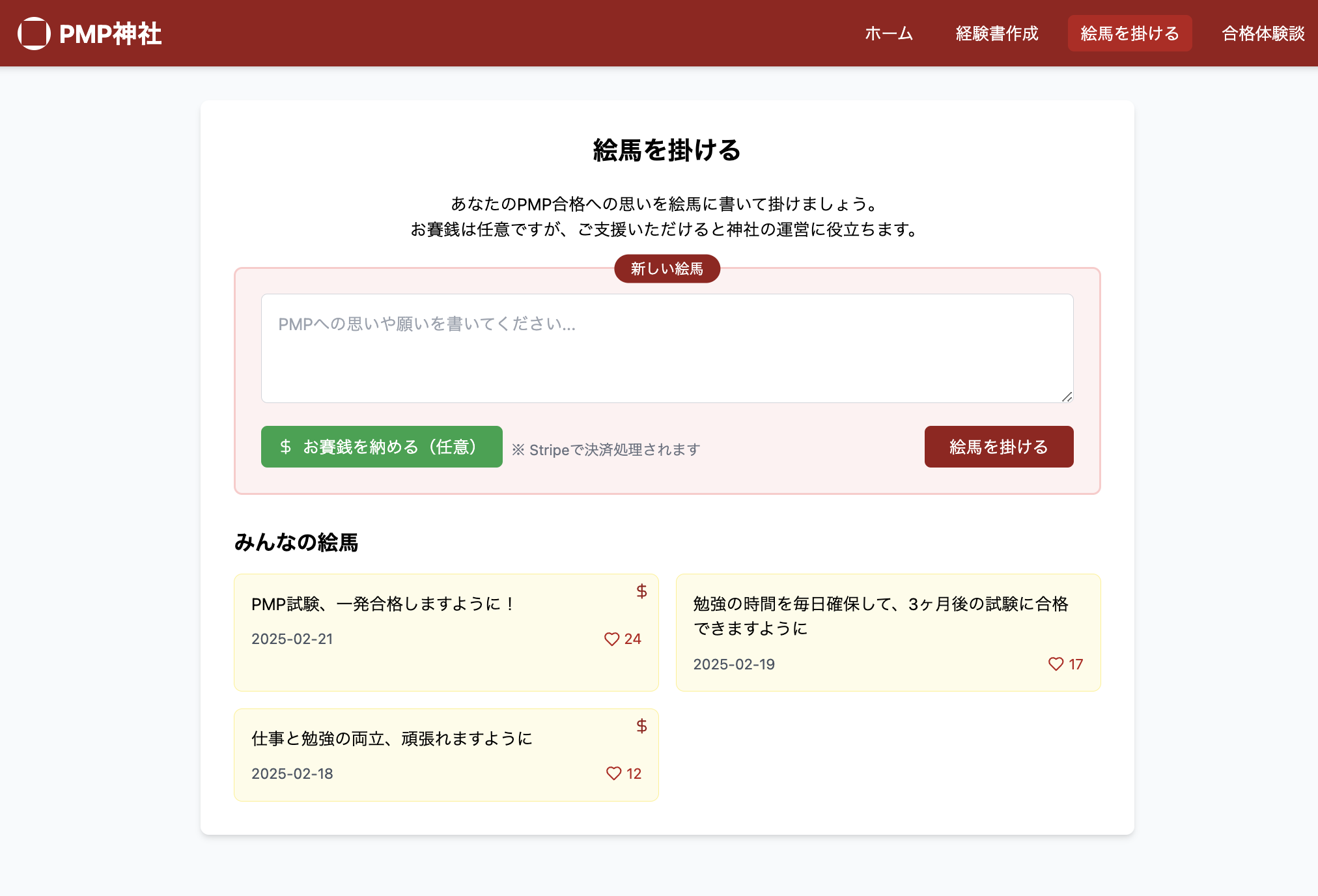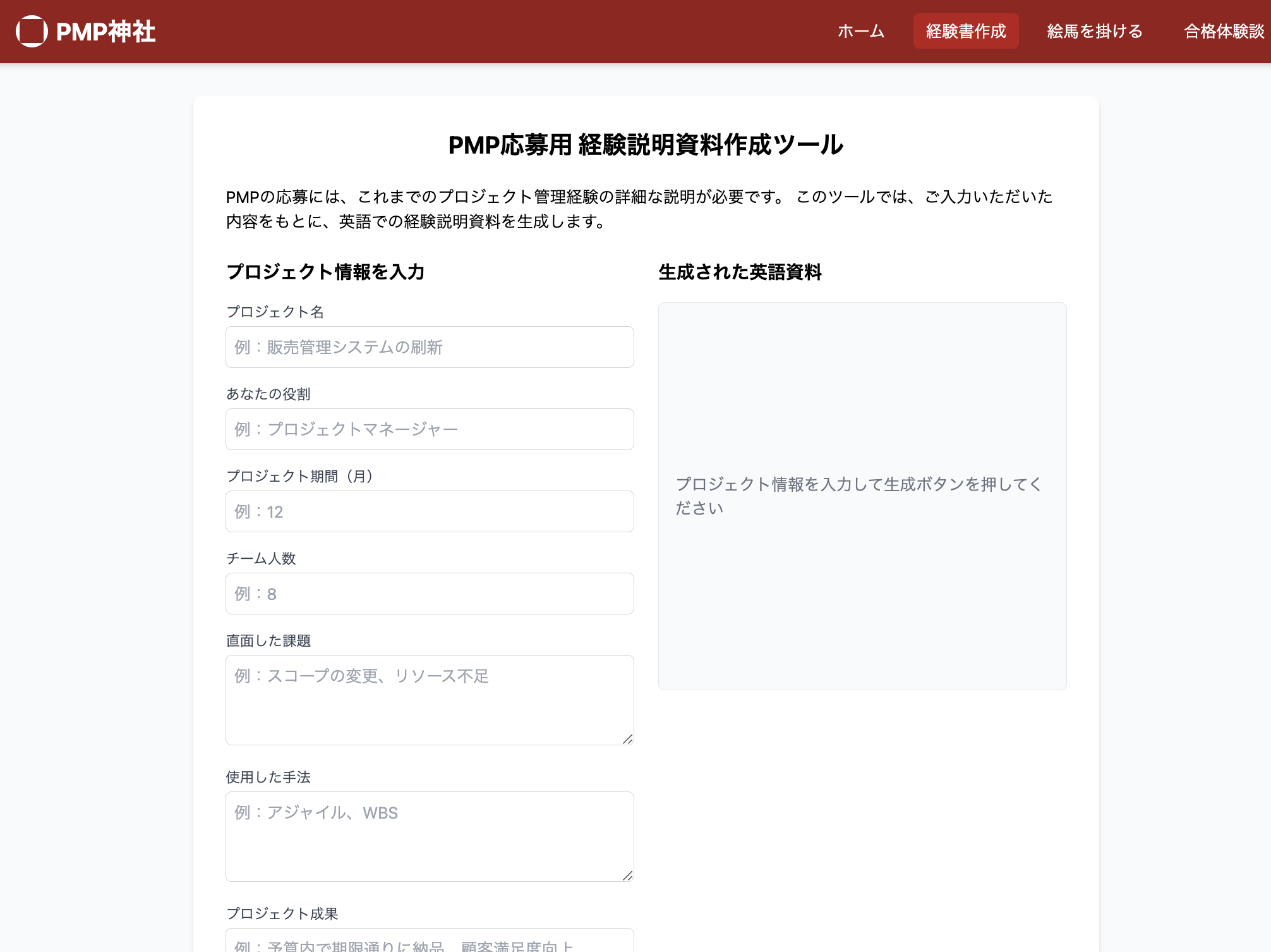 PMP試験の成功を応援するサービスです ・PMP試験のための英語の経歴文章を自動生成します ・絵馬を掛けて合格祈願ができます ・お賽銭を投げることができます ・合格までのロードマップページがわかります