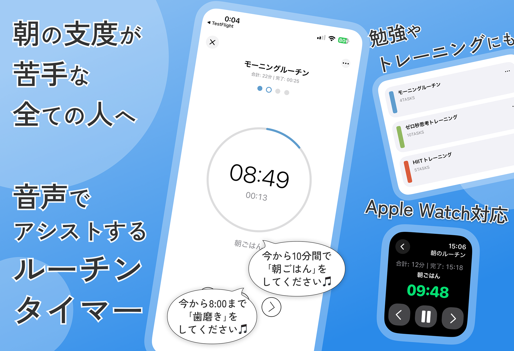 朝の支度が苦手な人、片付けが苦手な人のためのアプリです。 「やらなきゃいけないのに、気づけば時間が過ぎている…」そんな悩みはありませんか? 「Rutina(ルティナ)」は、タスクを順番にセットし、決めた時間で音声通知することで、スムーズな朝の支度、スッキリした部屋、集中できる時間をサポートします。 Apple Watch対応で、 手元で簡単に管理できるから、スマホを開く手間も不要です。 --- こんなあなたにオススメ - 朝の準備に時間がかかる - 片付けを始めても途中で気が散る - タスクを時間内に終わらせたい - ポモドーロ・タイマーを活用したい --- Rutinaの特徴 * タスクと時間を順番にセット –> やることを明確にシングルタスクにする * 音声でお知らせ –> 次の行動を迷わない * Apple Watch対応 –> 手元で簡単に確認 --- すでにユーザーの声ももらってます 「朝の支度が劇的にスムーズになった!」 「時計を見ながら焦ることがなくなった。すごい。」 「片付けが楽しくなった!」 「時間を区切ると意外とすぐ終わる。これは意外な気づき」