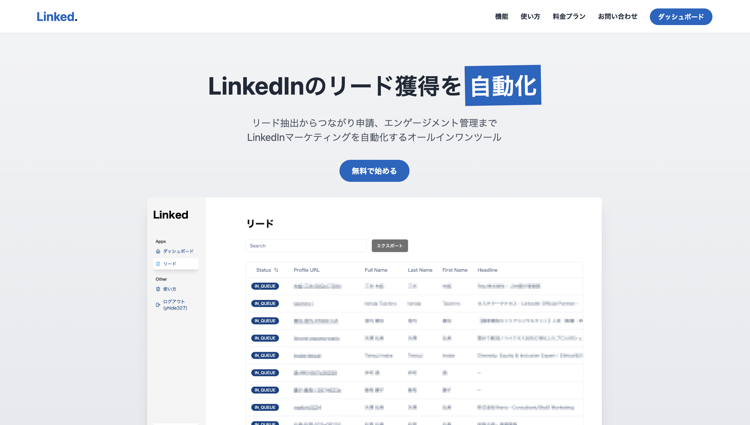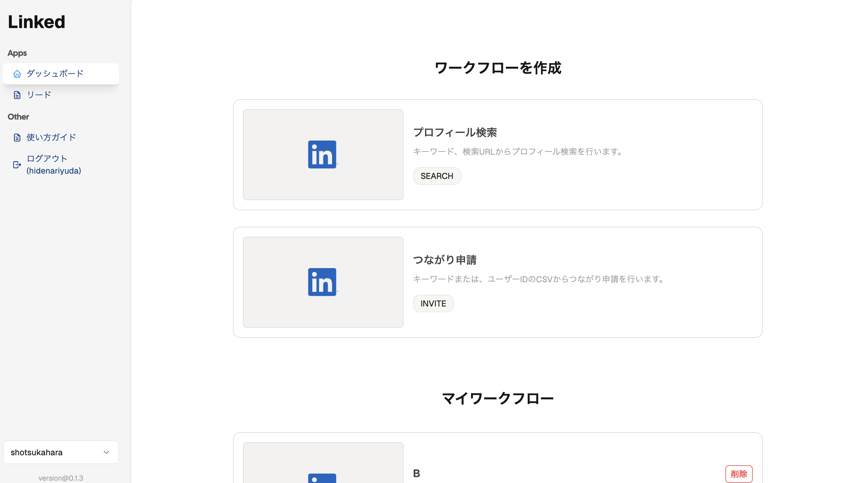 LinkedInのリード獲得を支援するサービスです! ▶︎機能 ・プロフィールリスト抽出 - 条件検索、特定企業・職種、投稿にいいねしたユーザーなどから抽出可能 - 指定時間に実行可能 - 500ユーザー/1回まで検索可能 - CSVエクスポート ・自動つながり申請 - 指定時間に実行可能 - 20ユーザー/1回まで検索可能 ・メッセージ送信 ※開発中 -AIエージェントでユーザーにパーソナライズしたDMを送信 ・投稿作成 ※開発中 ・自動いいね ※開発中 ▶︎技術スタック TypeScript, React, Next.js, App Router, jotai, Supabase, Postgresql, Google Cloud(Firebase, Cloud Run, Cloud Load Balancerなど)