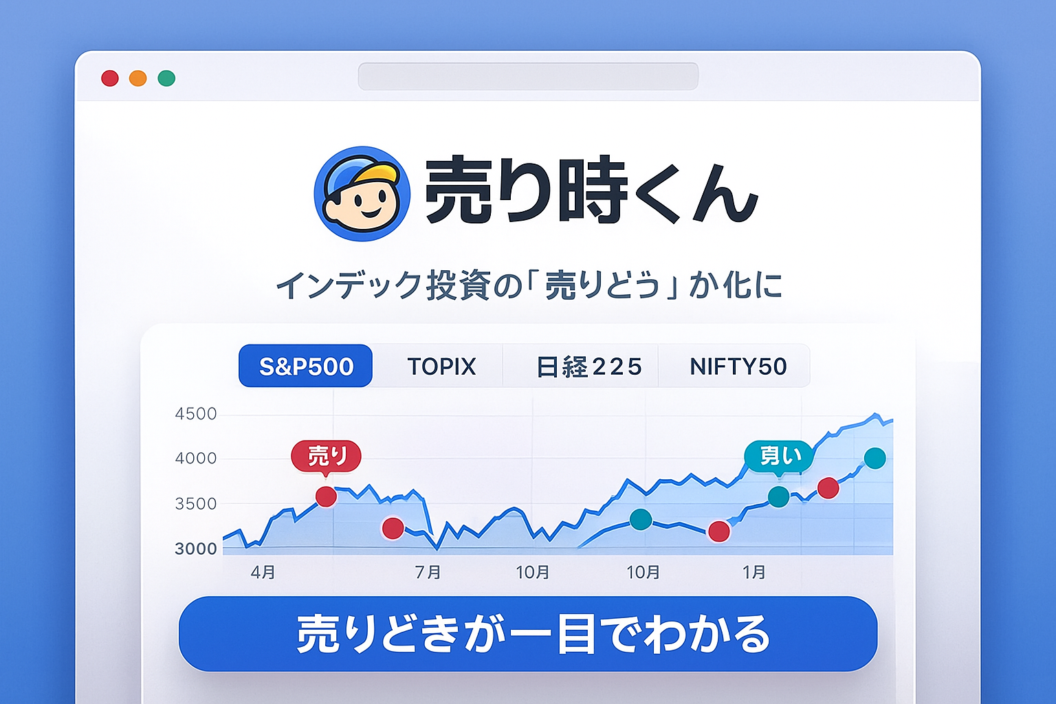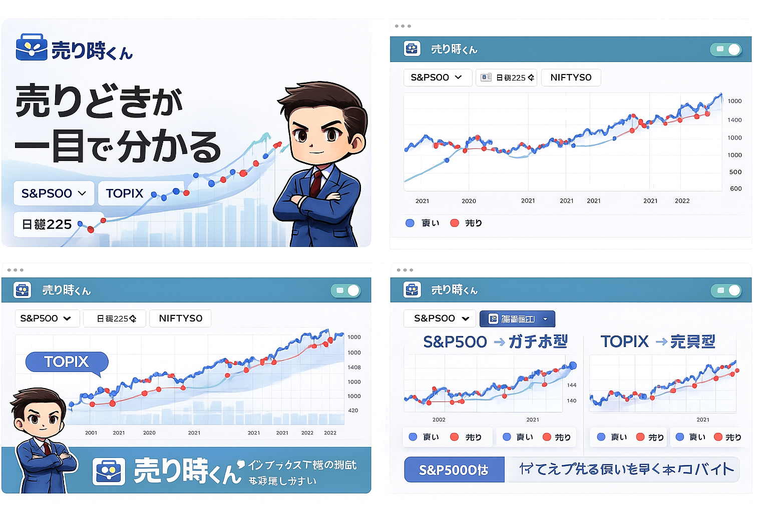 概要 🧭 これは何? 売り時くんは、インデックス投資の「売りどき」を自動で見える化するiOSアプリです。 S&P500 / TOPIX / 日経225 / NIFTY50 などの指数を切り替えるだけで、最適な売買タイミングを即時シミュレーションできます。 🎯 特徴(3ポイントで伝える) 1クリックで最適な売買タイミングを可視化 → 初心者でも理解できるシンプルUI 指数ごとの“最適戦略”が分かる → 例:S&P500=ほぼホールド、TOPIX=売買型 即時バックテスト機能付き → 手間ゼロでプロ級の分析 📈 対応インデックス S&P500 TOPIX 日経225 NIFTY50(インド株) ※順次拡張予定 💬 フィードバック募集 改善要望・機能追加リクエストを受け付けています! Solomaker / X / GitHub どこからでもどうぞ。