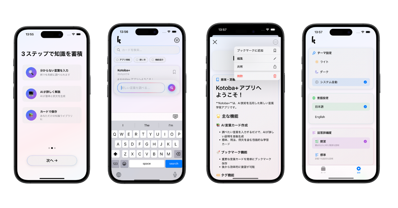 現代社会では、毎日のように新しい言葉や概念に出会います。しかし、その場で調べても、時間が経つと忘れてしまうことがほとんどです。 Kotobaは、そんな「学びの瞬間」を逃さず、知識カードとして蓄積することで、あなたの知識を着実に増やしていくアプリです。 🚀 主な特徴 📱 シンプルな3ステップ学習 わからない言葉を入力するだけ AIが詳細な説明を自動生成 意味・例文・関連タグを含む完璧な学習カード 🎨 美しいユーザー体験 Apple Design Guidelinesに準拠した洗練されたUI ダークモード完全対応 直感的な操作で学習に集中 🏷️ 効率的な知識管理 タグ機能による分野別整理 ブックマーク機能で重要な知識をマーク 強力な検索・フィルター機能 🌍 グローバル対応 日本語・英語の完全二言語対応 各言語に最適化されたAI応答 文化的コンテキストを考慮した説明 ⚡ パフォーマンス 高速な検索とスムーズなアニメーション Core Dataによる確実なデータ保存 オフライン機能で蓄積した知識をいつでも復習 💫 プレミアム機能 無制限のAI検索(無料版は月5回) AIキャラクター機能で個性的な学習体験 優先サポートと新機能への早期アクセス 👥 こんな方におすすめ 語学学習中の学生・社会人 専門分野の新しい用語を覚えたい研究者 読書中に出会った未知の言葉を記録したい読書家 日常的に新しい知識に触れる好奇心旺盛な方 🎯 Kotobaが選ばれる理由 AIの力で学習効率を最大化 - 従来の辞書アプリとは違い、文脈に合った説明と豊富な例を自動生成 美しさと機能性の両立 - 学習が楽しくなる洗練されたデザイン 確実な知識の蓄積 - 一度調べた内容は永続的に保存され、いつでも復習可能 成長する学習体験 - AIキャラクター機能により、あなたの学習スタイルに合わせた個性的な体験