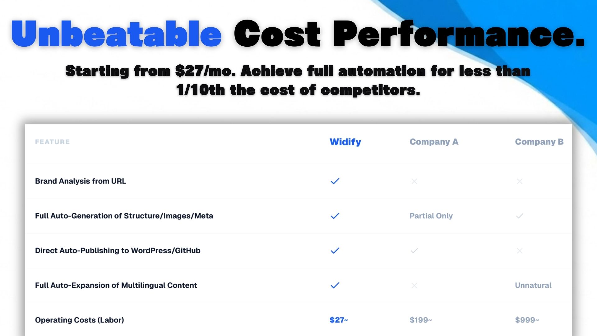 Widifyは、URLを入力するだけでAIがあなたの専属「マーケティングチーム」になる、メディア自動運用プラットフォームです。 分析したいサイトのURLを入力するだけで、AIがブランドのアイデンティティや競合を深く解析。単にGoogleで上位表示(SEO)されるだけでなく、ブランドの魅力を最大化して「読者をファンにする」広告級のSEO記事を自動生成します。さらに、完成した記事は多言語に翻訳され、WordPressやGitHubへ完全自動で投稿され続けます。