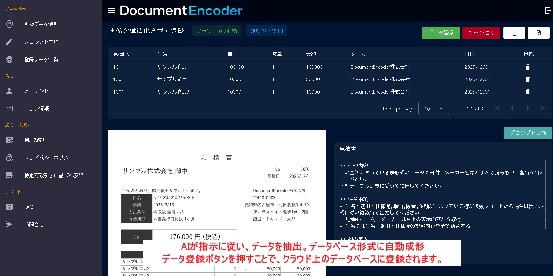 DocumentEncoder は、 画像や PDF を貼り付け、取得したい内容を日本語で指示するだけで、 AI が 「読む → 構造化 → 整形 → 登録」 までを一気通貫で行う 新しい AI-OCR サービスです。 単なる文字認識ではなく、現場の転記作業をなくし、 業務でそのまま使える形にデータ化することを目的に開発しました。 # 主な特徴 - 画像,PDF,スクリーンショットを貼り付け - 「どこを取得したいか」を日本語(自然言語)で指示するだけ (完全ノーコード) - 読み取りだけでなく加工や整形もAIにおまかせ - 高精度OCR(手書き文字にも対応) - DB登録もエクセル貼り付けも簡単 従来の OCR のような 「帳票テンプレート作成」「座標調整」「項目定義」は不要です。