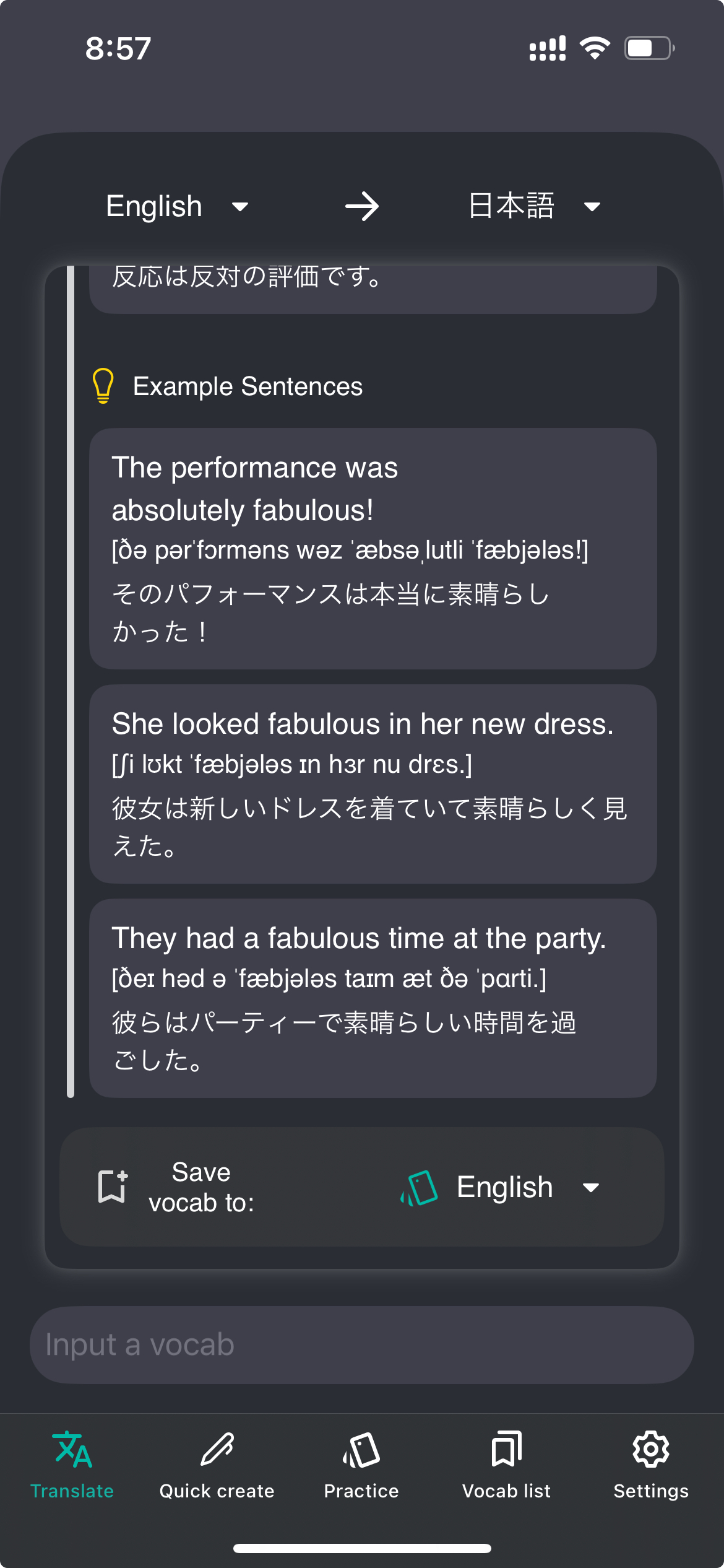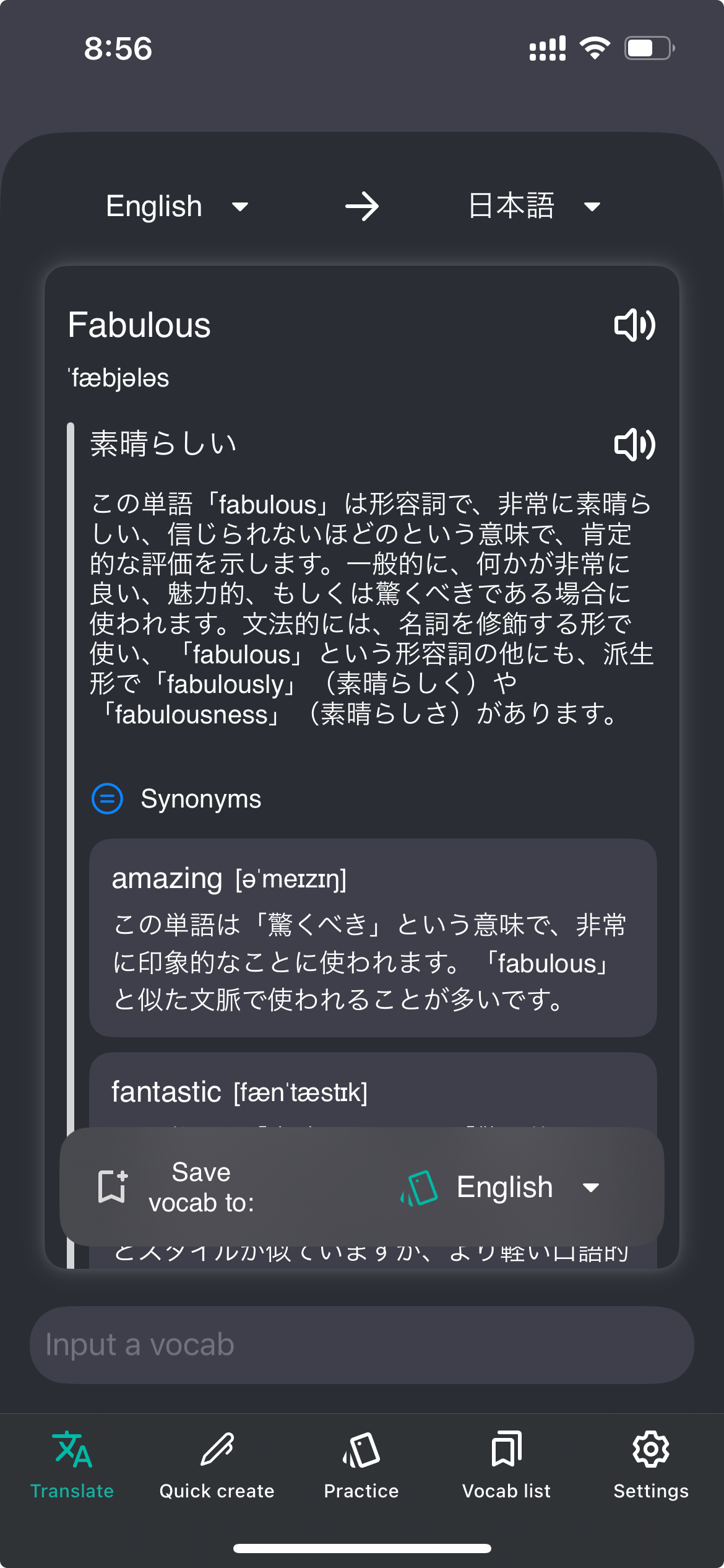 英語や中国語など、他の言語に学んだり使ったり中で知らない表現に遭遇した時に活躍するアプリです。アプリでそのフレーズを入力すると、ただの翻訳だけではなく、詳細な説明、同義語、対義語、例文まで詳細に教えてくれます。 調べたあとは、そのまま自分だけの単語帳に追加してあとから見直すことができます。以前は、Google翻訳で調べてそのあとは忘れる、という繰り返しだったので、それを解決するために作ったアプリです。 英語から日本語のように外国語から日本語にするだけでなく、反対側の翻訳も対応しています。例えば、「これって英語でどう表現するんだろう」という場合、知りたいのは入力したフレーズの同義語や対義語ではなく、出力する言語での複数のバリエーションになります。そういう文脈に応じた翻訳も行います。 また、どの言語にも対応しています。