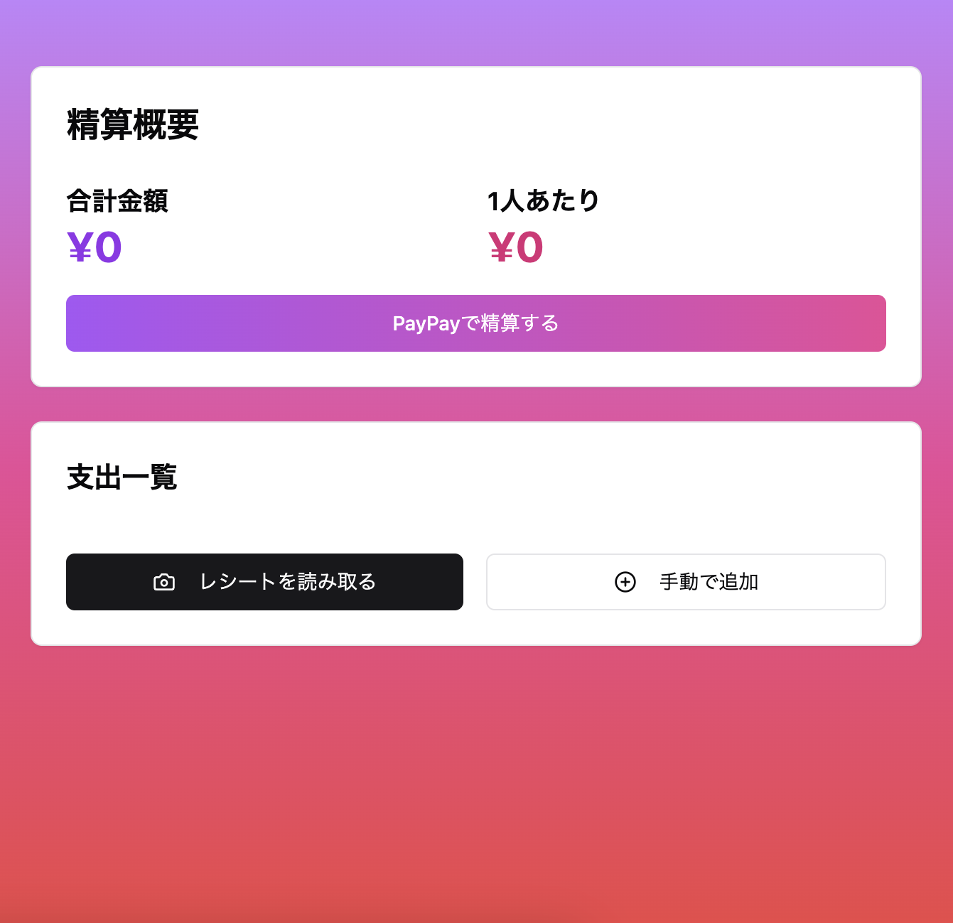飲み会やBBQ、スノボにサークル合宿などなど、イベントのお金を管理して割り勘してくれるサイト。 ・お酒代、車代など細かく支出を管理 ・レシート読み込みで簡単登録 ・PayPayリンクで簡単送金 この三つを実装中 ※AIでの開発のみで挑戦中