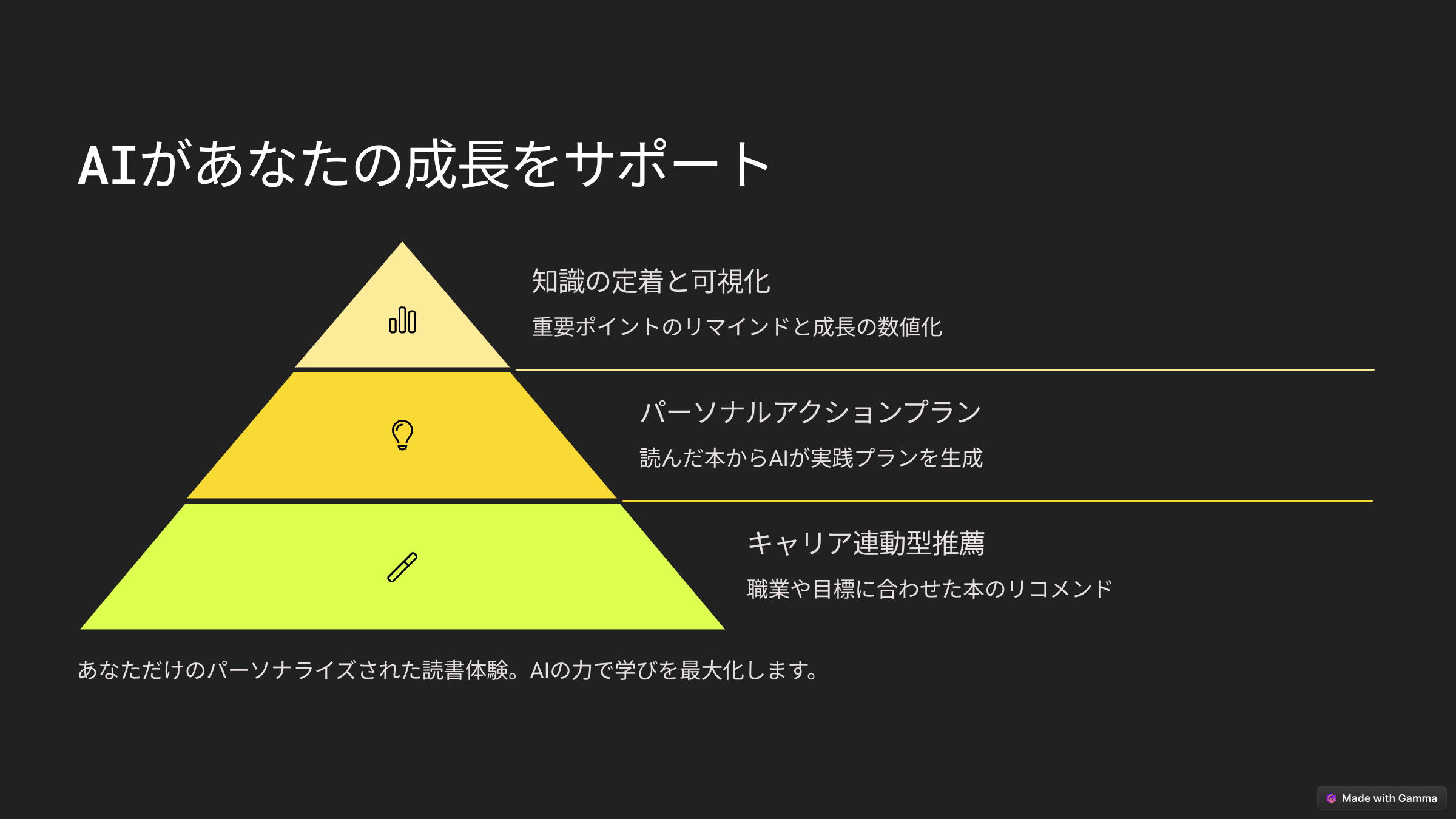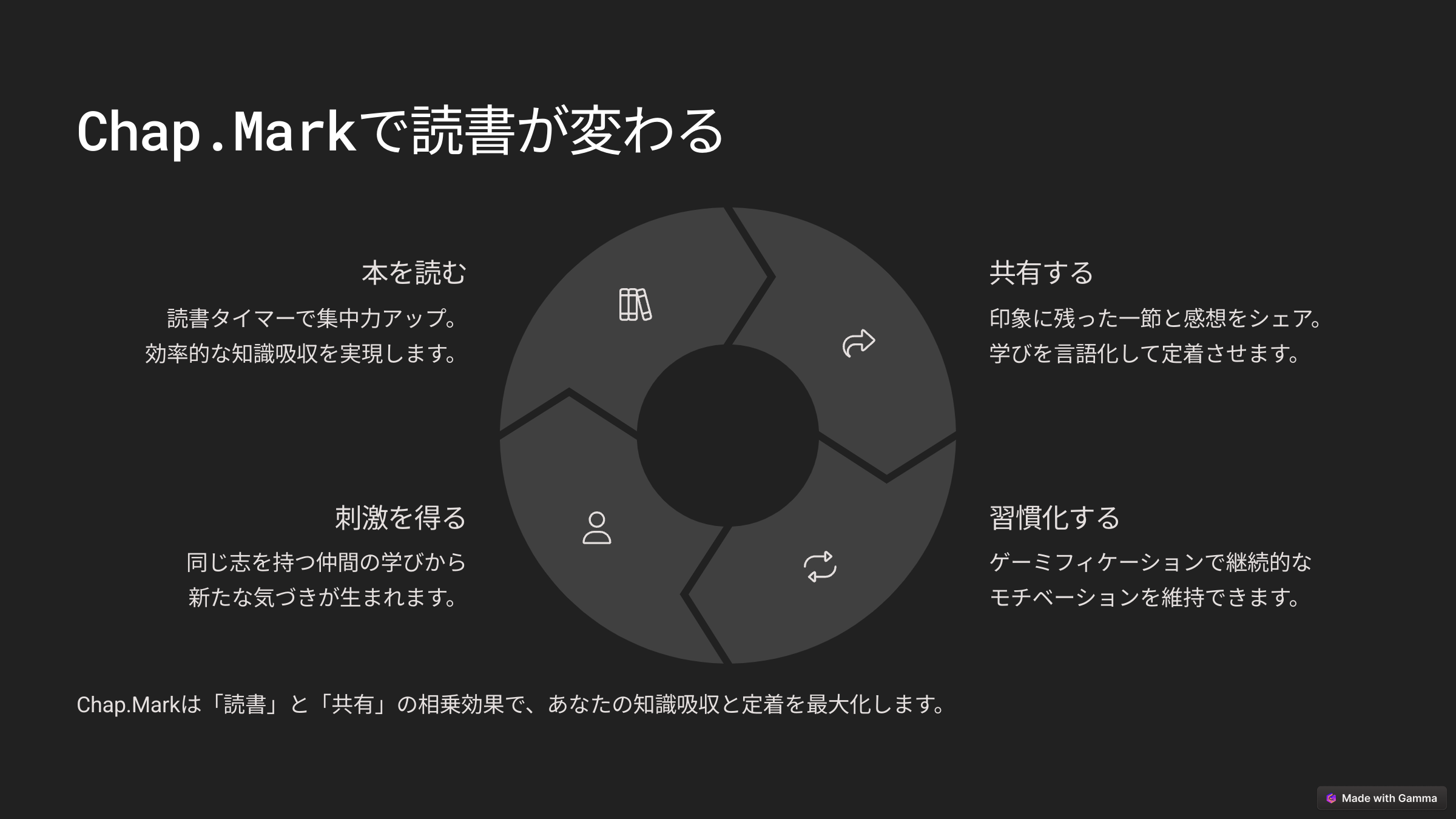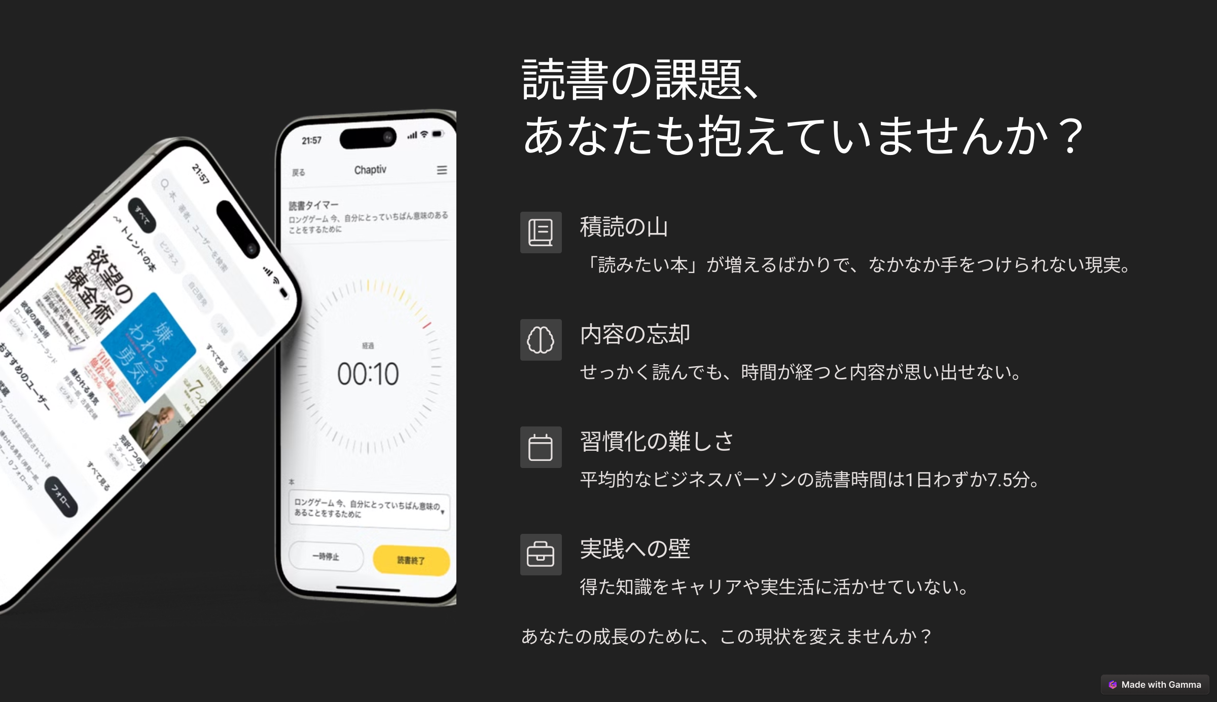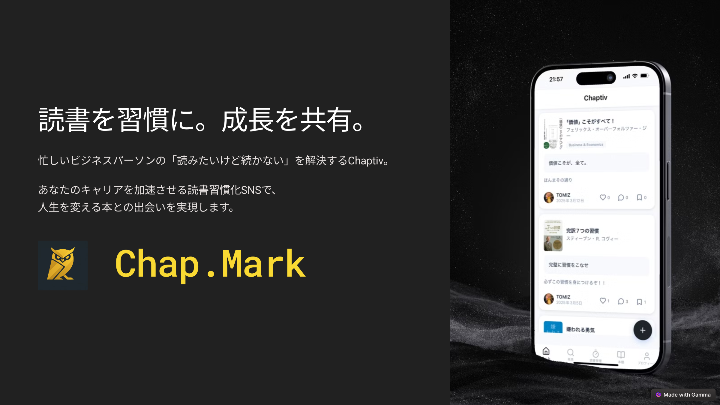 20代前半から30代後半の仕事に頑張るあなたへ。 日々の仕事が忙しくてなかなか読書が続かないという悩みがぼくにはありました。 「毎日読書をするのが楽しみになるようなアプリを開発したい」 その思いから開発をしています。主に以下のような機能があります。 【主な機能】 ・タイマーで進捗管理 ・感想を記録して仲間と共有 ・AIがあなた好みの本を提案し、読了後は要約とアクションプランまで作成 イメージは本のNewsPicksです。読書で知識をアップデートしていきましょう!