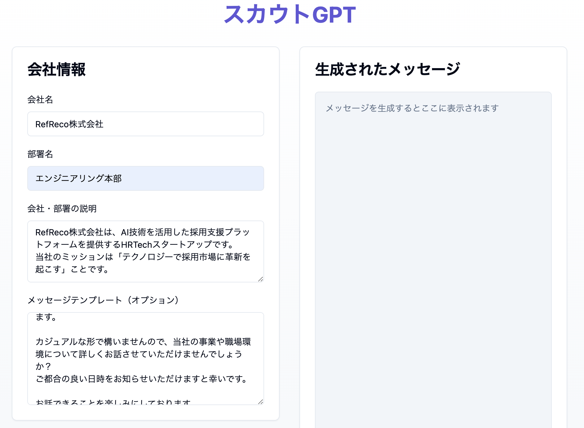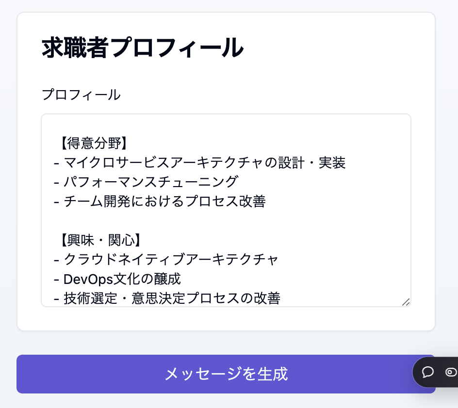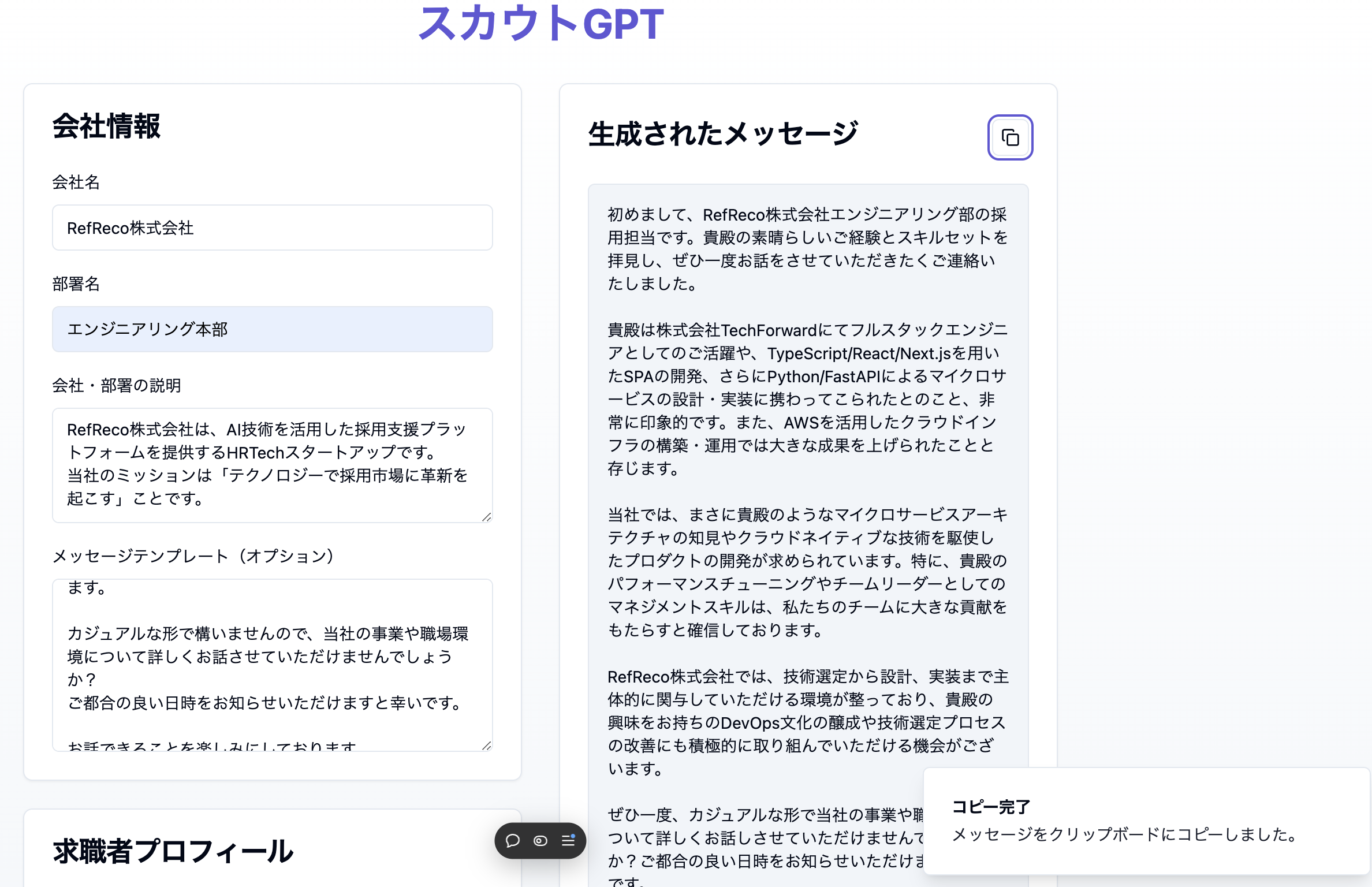 AIを活用して採用担当者が求職者一人一人に最適化された魅力的なスカウトメッセージを簡単に作成できるツールです。