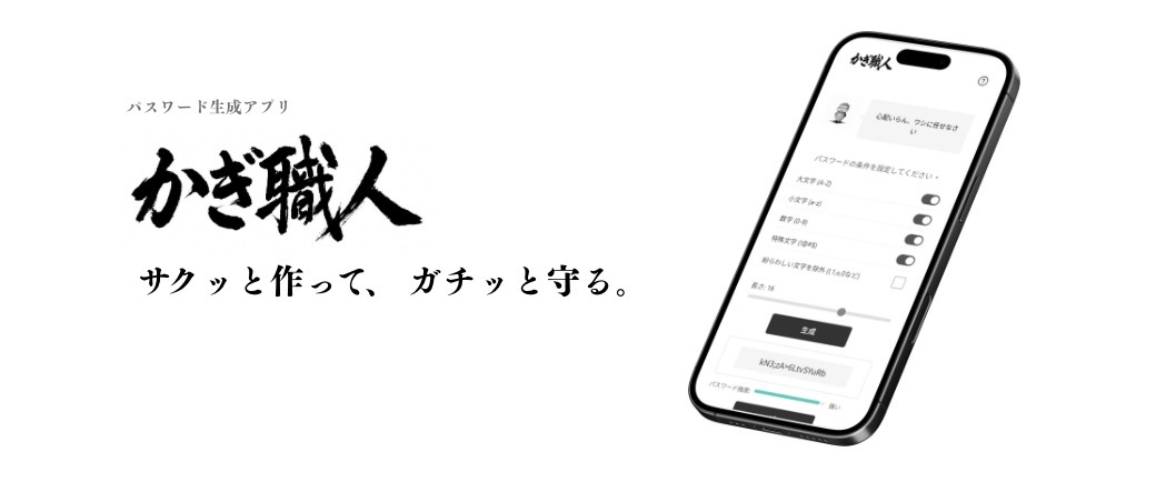 ✨ 概要 「かぎ職人」 は、ブラウザ上で強力で推測されにくいパスワードを簡単に生成できるツールです。ページを開くだけで操作でき、余計な登録やインストールは不要になっています。 🧰 主な機能 🧠 強力なパスワード生成 • 人が考えにくいランダムで強いパスワードを一瞬で作れます。 • 総当たり攻撃(ブルートフォース)に対しても強い設計です。  ⚙️ カスタマイズ可能 • 文字数の指定 • 使用する文字種(大文字・小文字・数字・記号)の選択 これにより、用途に合わせて柔軟なパスワードを生成できます。 🖱 ワンクリック操作 • 条件を選んで「生成」ボタンを押すだけでOK。 • 生成されたパスワードはすぐにコピーして利用できます。 🔒 セキュリティ重視 • 生成されたパスワードは記録・保存されません(プライバシー配慮)。 • すべての機能が無料で使えます。 📌 こんな人にオススメ • 新しいサービス登録時に毎回安全なパスワードを考えるのが面倒 • いくつもサービスを使っていてパスワード管理が不安 • 強いパスワードを手軽に作りたい こんな用途でサッと利用できます。