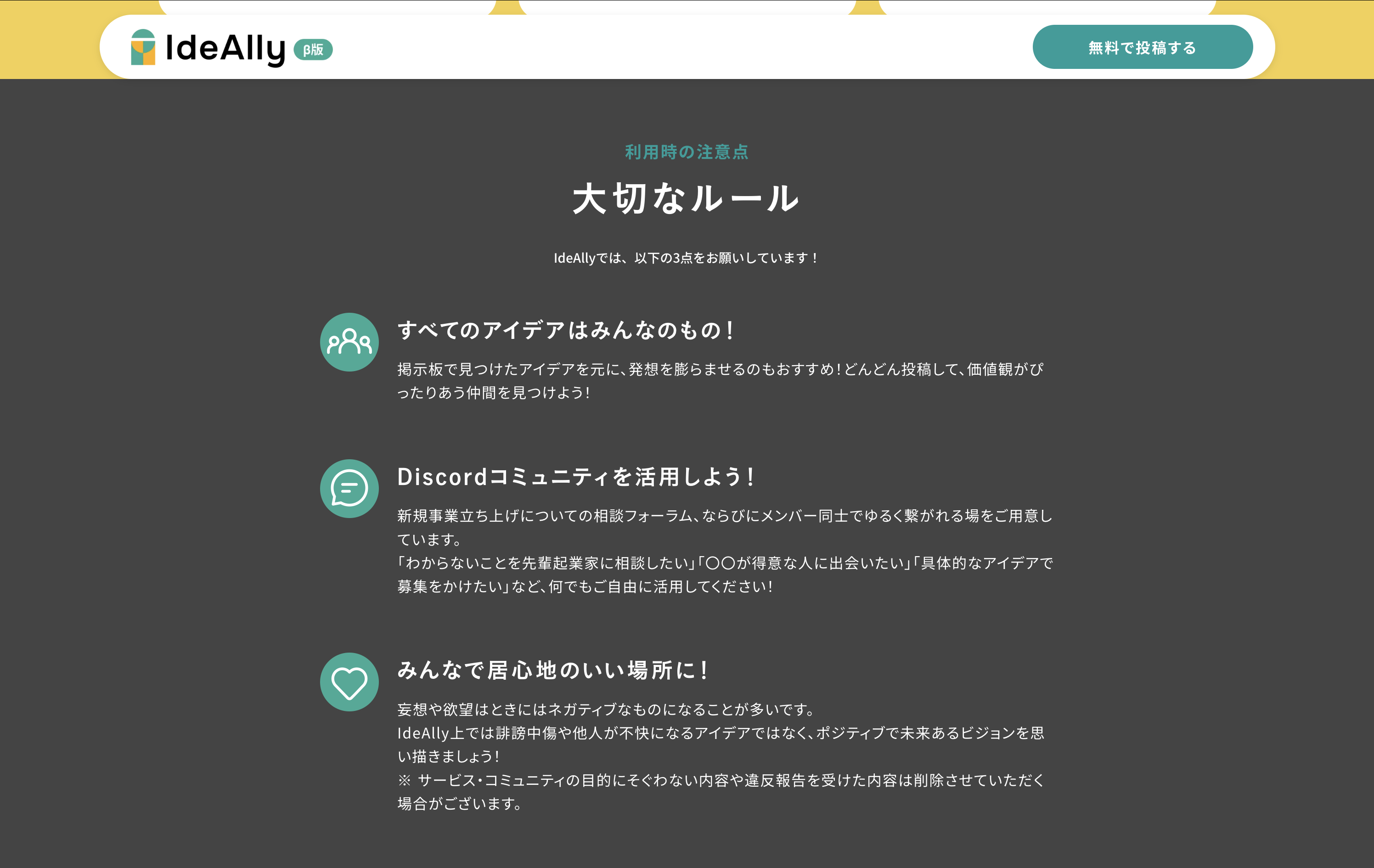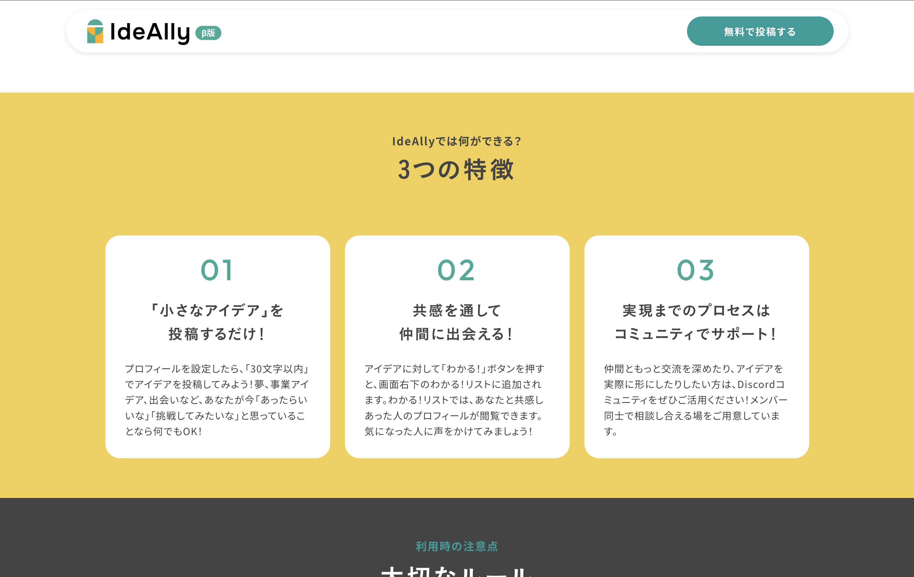 IdeAlly(アイデアリー)は、30文字以内の小さなアイデアを通して、価値観の合う仲間に出会える掲示板です。あなたの「あったらいいな」「やってみたいな」を気軽に投稿してみよう! --- 初めての個人開発です!Cursor大先生の力を借りながらサービスを運営しています!