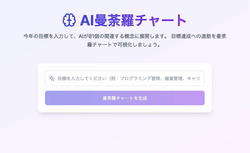 AI曼荼羅チャートは今年の目標の解像度を上げることができるツールです。 目標を入力することで、81のグリッドで曼荼羅チャートを瞬時に生成します。 生成された曼荼羅チャートを画像保存可能。 無料、ログイン不要で使えます。ベータ版の開発時間はAI駆使して40分ほど。