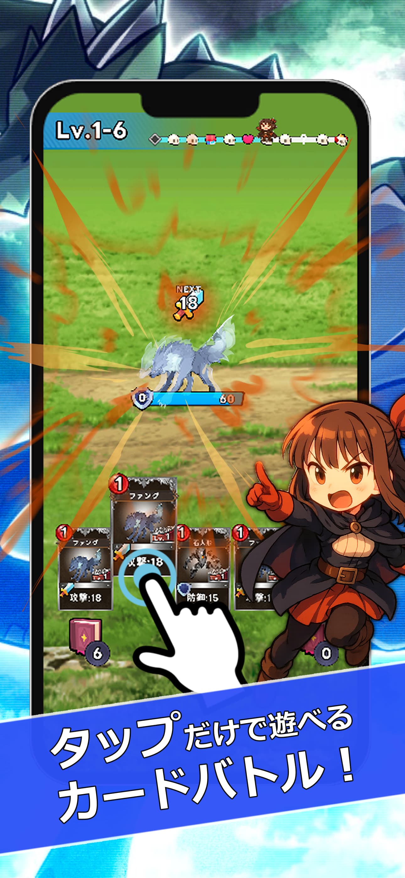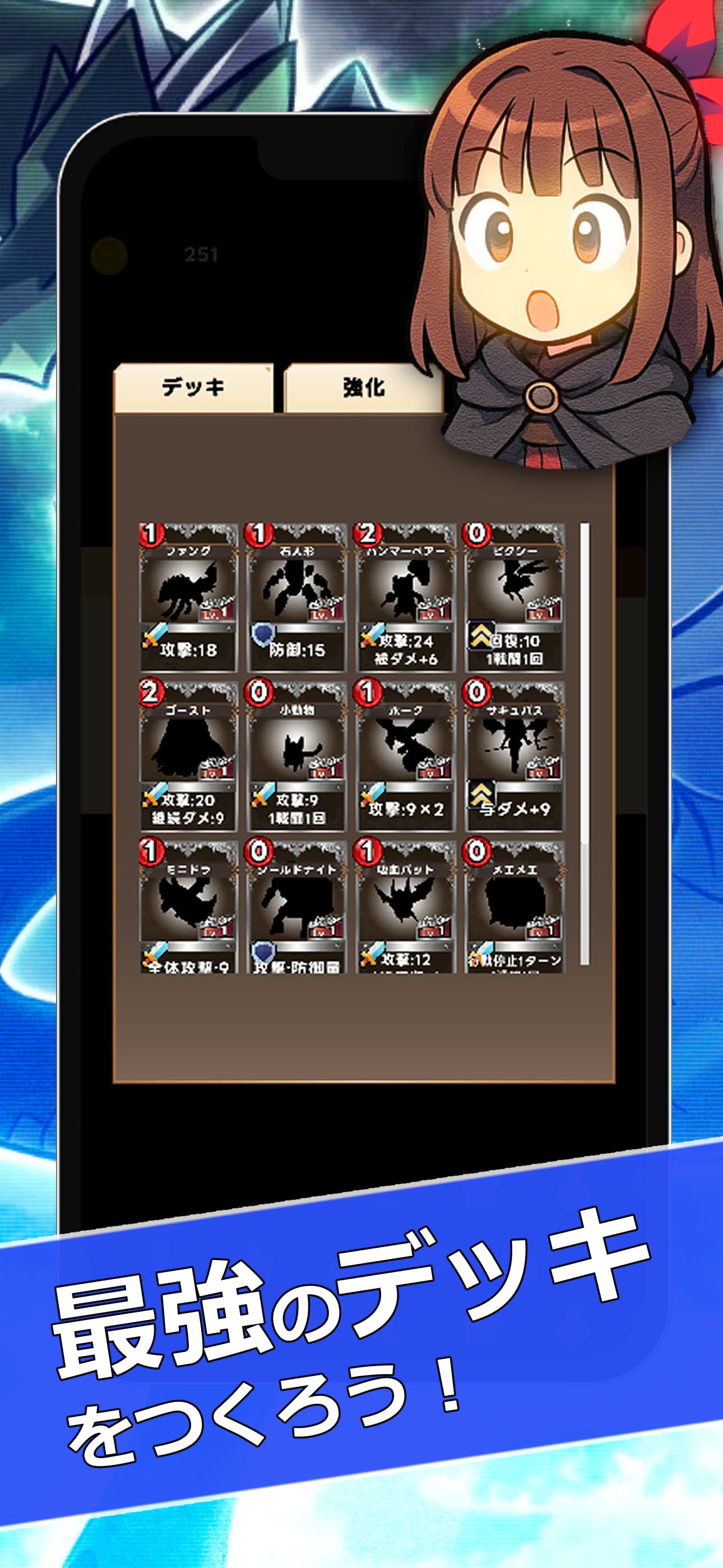 人気の戦略カードバトルゲームをもっとシンプルに気軽に遊びたい人におすすめのゲームができました! タップだけの簡単操作でシンプルにぽちぽち遊べるカードデッキ構築型RPGゲーム! ローグライト要素もあり他のゲームの合間にやりこんで遊ぶサブゲームとしてもぴったり。 デッキからカードを選んで攻撃!倒したモンスターが仲間カードになる。 多彩なスキルを持つモンスターカードをどんどん集めて最強のデッキを育成! スマホで遊びやすい縦画面。ターン制のバトルはいつでも中断できるのでスキマ時間にコツコツ進めるのにぴったりです。 【ゲームの特徴】 ・シングルプレイ専用でシンプルな戦略ターン制カードバトルです。 ・敵モンスターの次のアクションを見て最適なカードを選択してタップ。考えてもよし、考えたくない時は適当にぽちぽちしててもなんとかなる! ・倒したモンスターが新たに仲間として手札カードデッキに加わります。どんどん仲間に加えて自分だけの最強のデッキを育成しましょう。 ・多彩なモンスターを仲間にし、育て、さらに強いモンスターカードをあつめましょう! ・もちろん最初から最後までずっと無料。通信の悪い環境でもオフラインでいつでも遊べます。