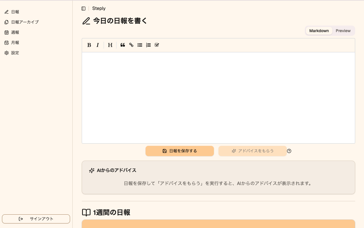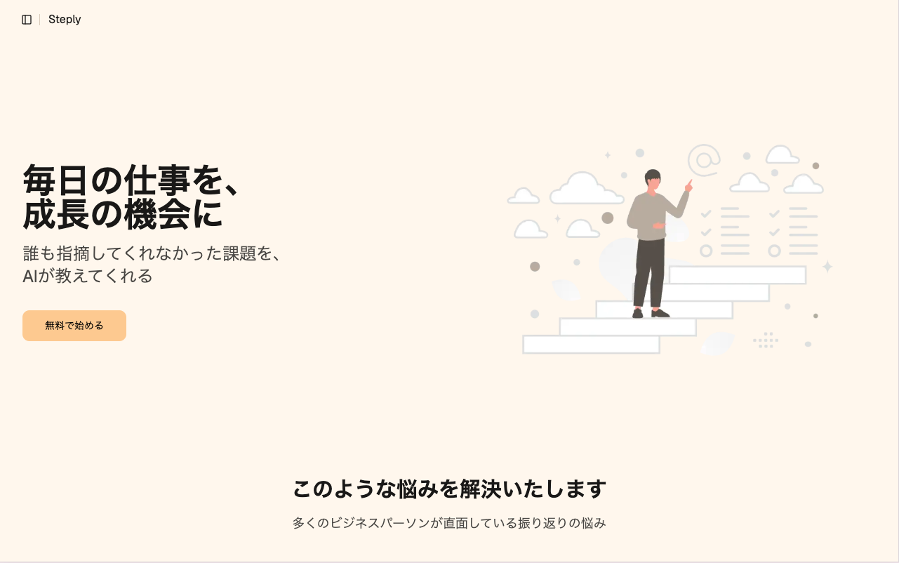 「振り返りって大事だとわかってるけど、なかなか書けない…」 「フィードバックがほしいけど、誰に相談したらいいんだろう…」 そんな経験、ありませんか? Steplyは、あなたの振り返りをAIがサポートする新しいツールです! ・😓「今日も何も成長できていない」をなくす ・その日のうちに、AIから具体的な成長ポイントが見える ・「今日は特に何もない」と感じる日でも、意味のある振り返りができる ・小さな進歩も見逃さず、着実な成長を実感できる ・💡本質的なフィードバック ・経験豊富なメンターのように、建設的な視点を提供 ・あなたの目標や状況に合わせた、パーソナライズされたアドバイス ・💭「誰かに相談したい」が、すぐ解決 ・遠慮や気兼ねなく、24時間いつでも相談できる ・「この程度で相談していいのかな...」という悩みもすぐに共有 ・上司には言いづらい悩みも、AIなら気軽に打ち明けられる ・🎯「成長している気がしない」に終止符 ・日々の小さな変化を可視化 ・これまで気づかなかった自分の強みが見える ・具体的な改善アクションまで提案してくれる こんな方におすすめ ・毎日忙しくて、振り返りどころではない ・振り返りを書いても、それが成長に繋がっている実感がない ・フィードバックをもらいたいけど、相談できる人がいない ・「今日は特に何もなかった」と思う日が多い 始め方はカンタン 1. 思ったことを、箇条書きでサクッと書く 2. AIが、あなたの中に眠る気づきを引き出す 3. 「あ、そうだったかも」という発見が、毎日の楽しみに 明日への具体的なアクションが見えない。 誰かに相談したくても、相談できる人がいない。 そんなあなたの悩みを、Steplyで解決しませんか?
