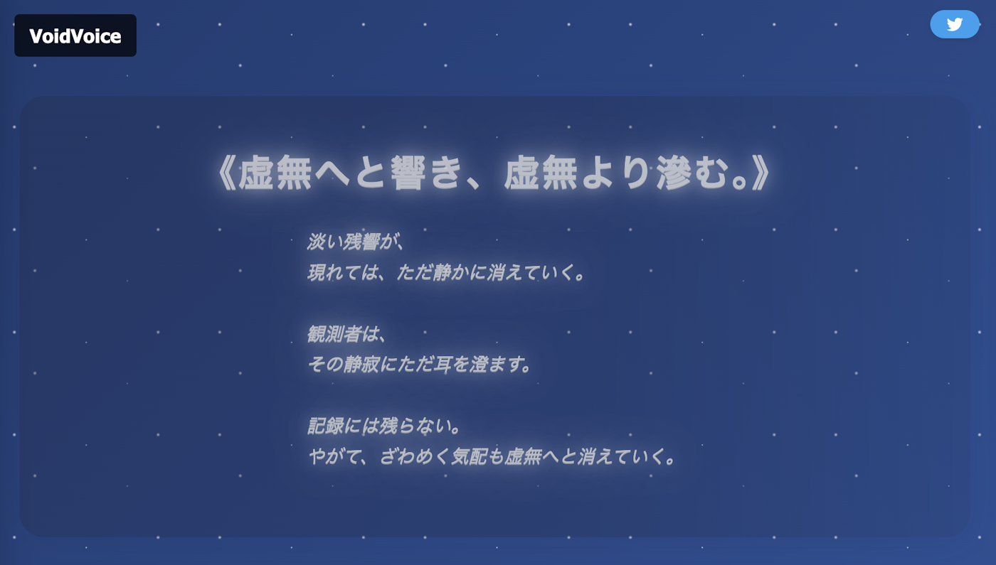 VoidVoice (ボイドボイス/ヴォイドヴォイス)は、 配信者の音声がリアルタイムにテキストへ変換され、 観測者(視聴者)へ一方向に届けられる配信サービスです。 観測者(視聴者)は、 気になる発信点(配信部屋)に接続することで、 リアルタイムの配信をテキストで楽しむことができます。 観測したテキストはしばらくすると流れ去り、 過去ログとして残ることはありません。 また、 リアルタイムの観測者数(同時接続数)は 配信者にも観測者にも表示されません。 ただ、“気配”として曖昧に示されるのみです。 VoidVoice は、 音では届かず、テキストとしてだけ現れる配信体験を提供します。