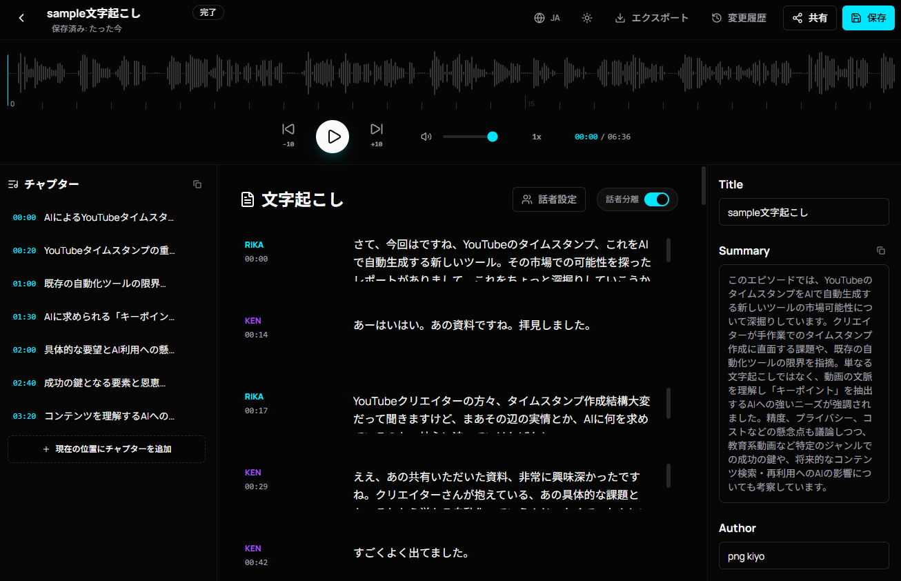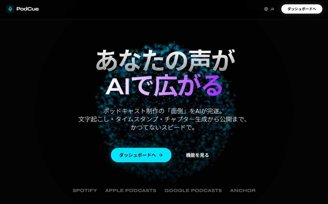 ポッドキャスト制作の「面倒」をAIが完遂。 文字起こし・タイムスタンプ・チャプター生成から公開まで、かつてないスピードで。