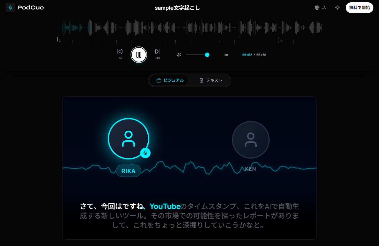 PodCueは、ポッドキャスト配信者のためのオールインワンAIツールです。最新のAIモデルを使用し、多人数会話の正確な文字起こしから、トピックごとのチャプター生成までを全自動化。Webプレイヤーでの共有や、ブログ用テキストの書き出しもワンクリックで行えます。Webプレイヤー共有は音声と同期する「カラオケ字幕」付きプレイヤーで共有。耳が不自由な方でも、あなたのポッドキャストを楽しめるバリアフリーな体験を提供します。