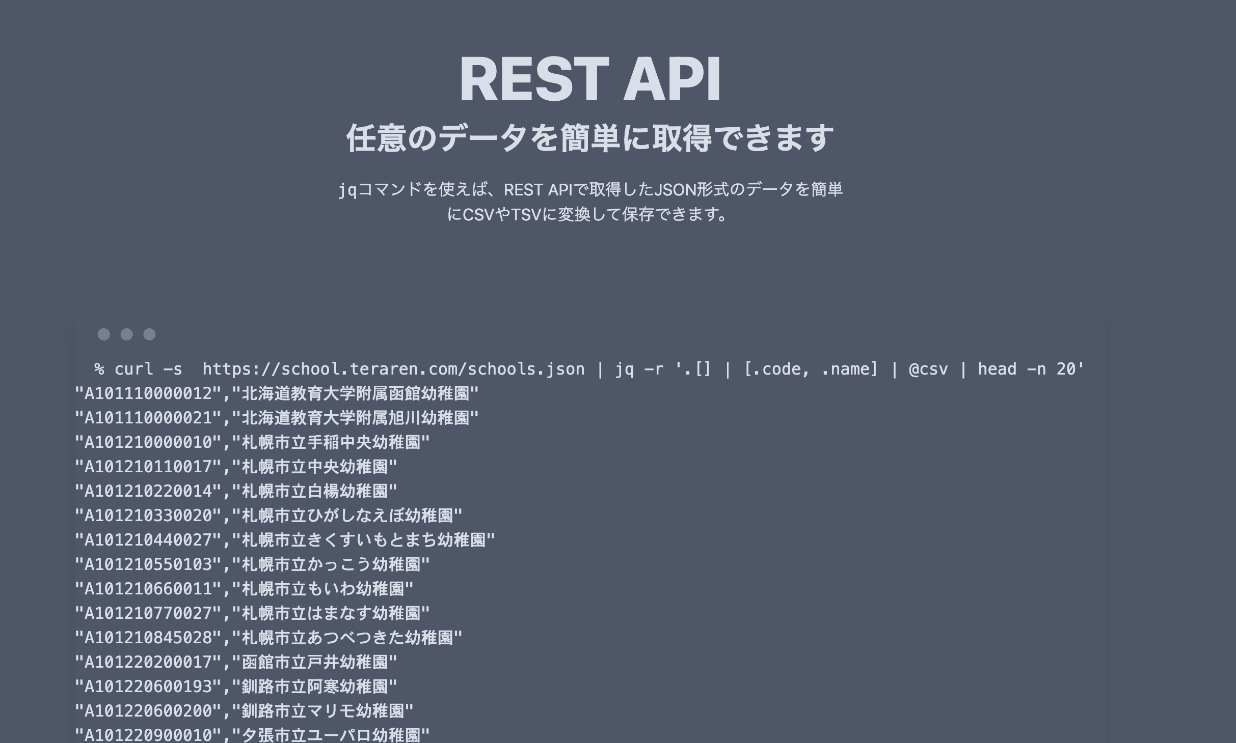 任意のデータを簡単に取得できます jqコマンドを使えば、REST APIで取得したJSON形式のデータを簡単にCSVやTSVに変換して保存できます。