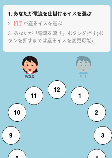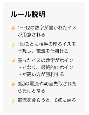 2人で遊ぶ電気椅子ゲームです。 【ルール説明】 ・ 1~12の数字が書かれたイスが用意される ・ 1回ごとに相手の座るイスを予想し、電流を仕掛ける ・ 座ったイスの数字がポイントとなり、最終的にポイントが高い方が勝利する ・ 3回の電流や40点先取されたら負けとなる ・ 電流を食らうと、0点に戻る