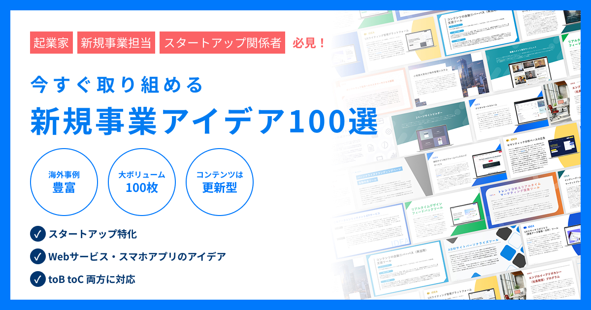 個人開発者・ソロプレナー・スタートアップ関係者 必見! 新規事業アイデア100選をまとめました。 Webサービス・スマホアプリのアイデアだから今すぐに取り組めます。 ▼こんな悩みを解決します ・個人開発したいけどネタがない... ・起業したいけどアイデアがない... ・新規事業担当なのに何も思いつかない... アイデアは0から生み出すものではなく、様々な既存アイデアを大量にインプットして参考にしながら見つけていくものです。 そこで、本サービスでは新規事業アイデアを100選にまとめて提供しております。 ▼アイデアの特徴 ・スタートアップ向きのアイデアが豊富 ・toB toC 両方のアイデアを掲載 ・Webサービス・スマホアプリのアイデアだからすぐに取り組める ▼サービスの特徴 ・圧倒的なボリューム!100枚のスライド収録 厳選した100個のアイデアを1スライドに1つずつ収録。 アイデアのタイトルと詳細な説明を掲載しています。 ・100選で終わりじゃない!更新型のコンテンツ 新規事業アイデアは随時追加予定。 100選で終わりではない、更新型のコンテンツです。 ・海外事例も豊富に参照 海外スタートアップの事例も豊富に収録しています。 見るだけでインスピレーションが湧いてくること間違いなし!