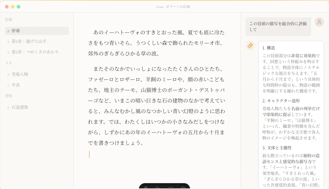 作品の全ファイルを読み込み、文脈を理解したAIが、あなたの編集者になる。 壁打ち・批評から、国立国会図書館サーチと連携した資料調査まで——長編執筆のためのmacOSネイティブアプリです。縦書き・ルビ・傍点など日本語組版にも対応。