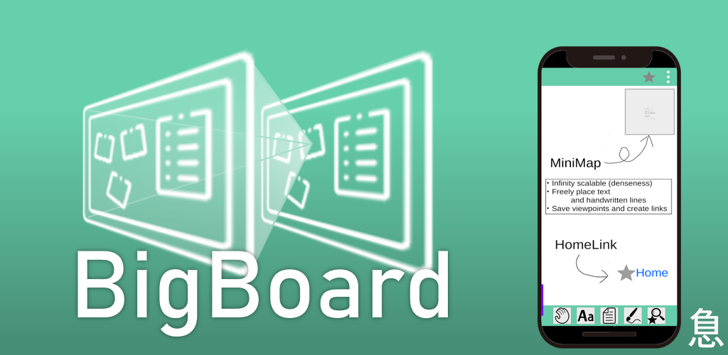 「BigBoard」はより現実に近い「机の上」や「ホワイトボード」の使用感の再現をコンセプトに作成されたメモ帳アプリです。 キャンバスは理論上無限に大きく、その上に「テキストメモ」や「手書きメモ」を自由に配置・再配置することができます。さらに無限拡大・縮小が可能(稠密性)なので3次元的なデータ管理が可能となり、より現実空間での情報整理と近い感覚で使用できます。